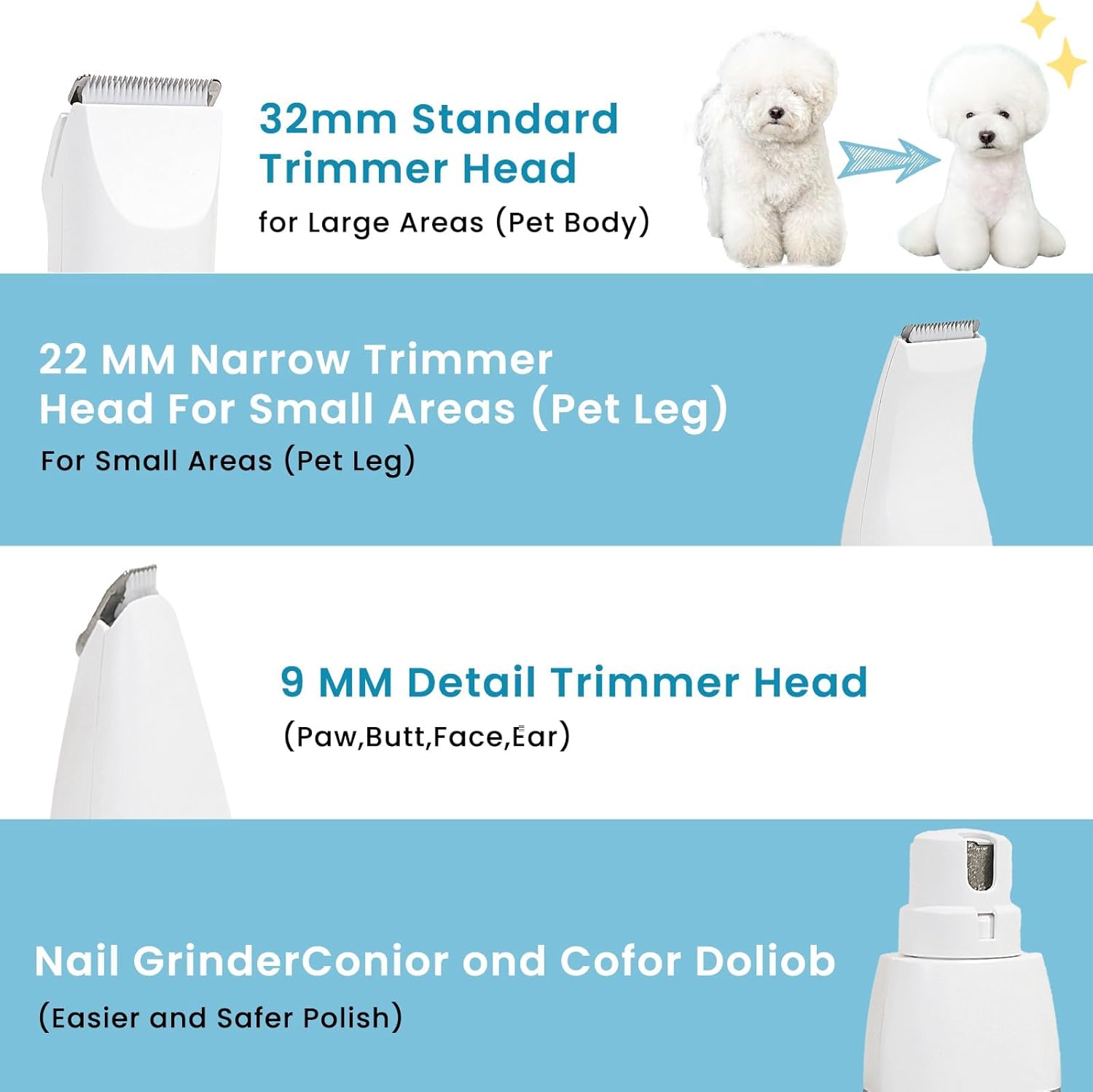 - 🐶What You Get: 4-in-1 pet grooming set including: 8. 1.1 x 32mm blade pet grooming clipper with 3 guide combs (3mm, 6mm, 10mm) 2.1 x 22mm narrow blade pet hair trimmer with 1 guide comb 3.1 x 9mm detail pet hair trimmer 4.1 x pet nail grinder Become your pet's personal groomer at home.