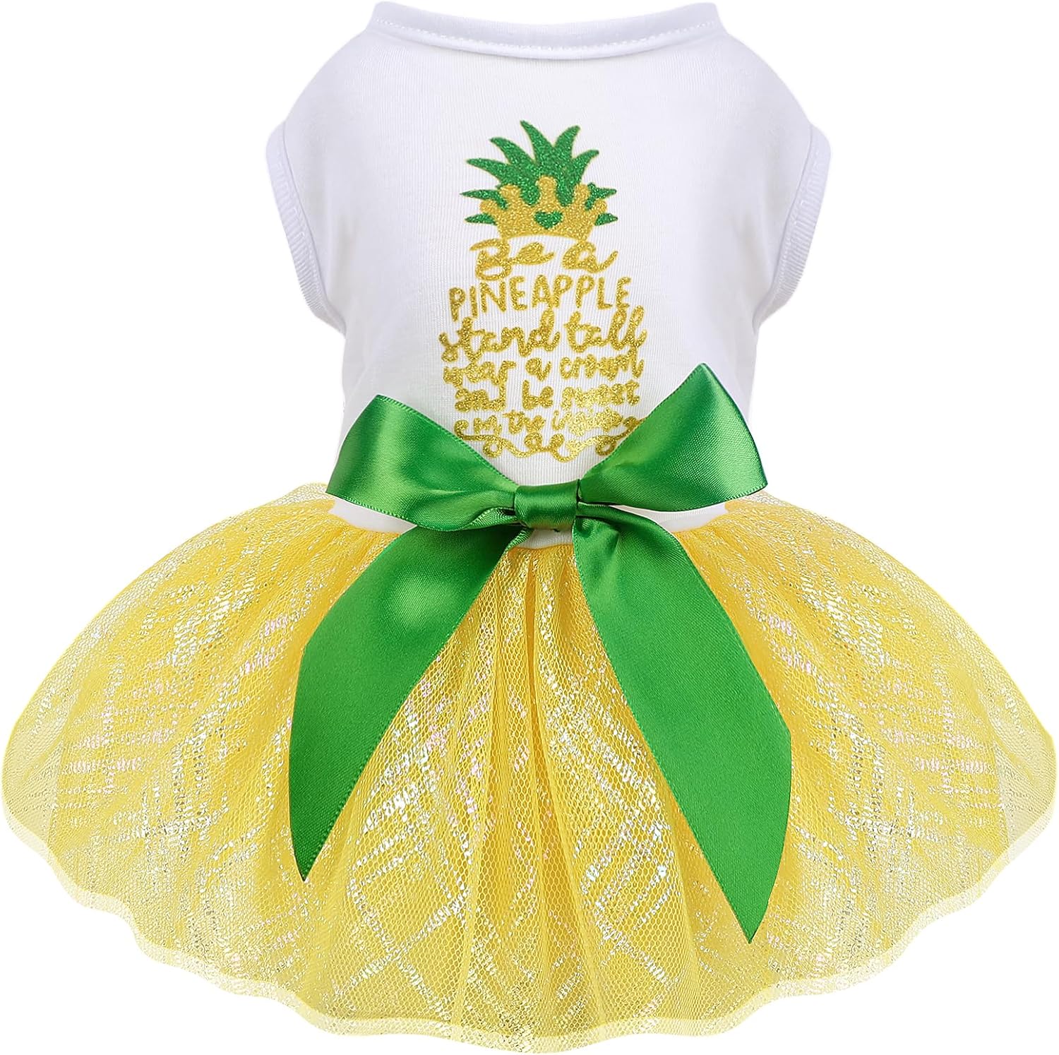 【Fashion Dog Outfits Design】 Dog tutu dresses with watermelon / doughnut / pineapple / daisy pattern, puppy clothes pullover design, elastic under belly for perfect fit. The sleeveless and round neck design allows you to help your pets easily put on and take off the pet dress. The attached ribbon bowknot enhances princess style of the dog outfit.
