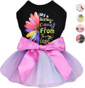 【Fashion Dog Outfits Design】 Dog tutu dresses with watermelon / doughnut / pineapple / daisy pattern, puppy clothes pullover design, elastic under belly for perfect fit. The sleeveless and round neck design allows you to help your pets easily put on and take off the pet dress. The attached ribbon bowknot enhances princess style of the dog outfit.