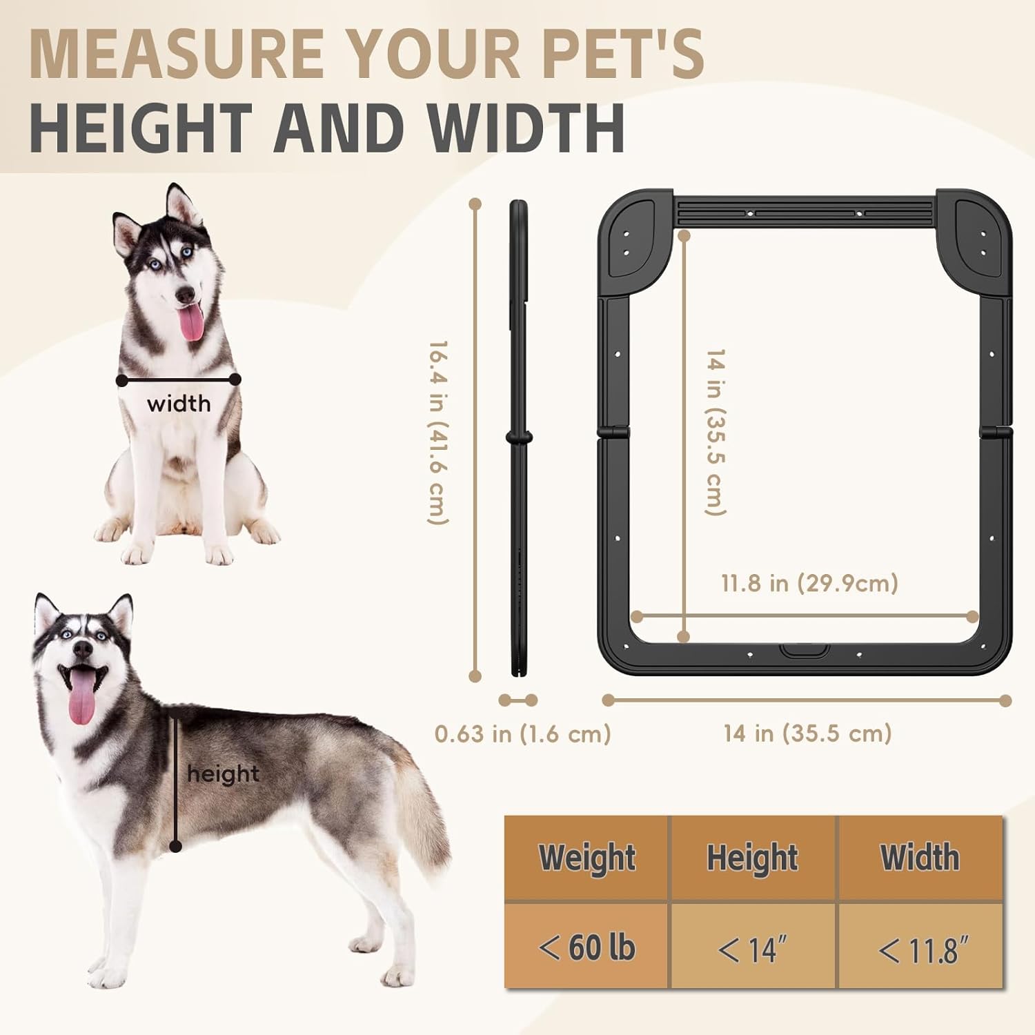 - Freedom of Movement for Your Dog: Our dog door for screen door is specially designed for your pets to move in and out conveniently and freely, providing more fun for your beloved furry friend. Inside size: 14×11.8 inches; outside size: 16.4×14 inches. It is suitable for pets up to 60 pounds.
