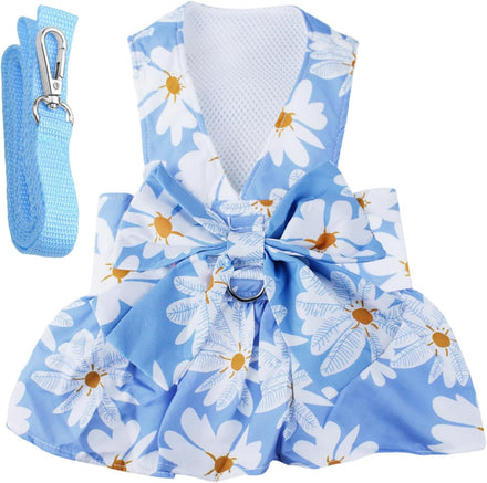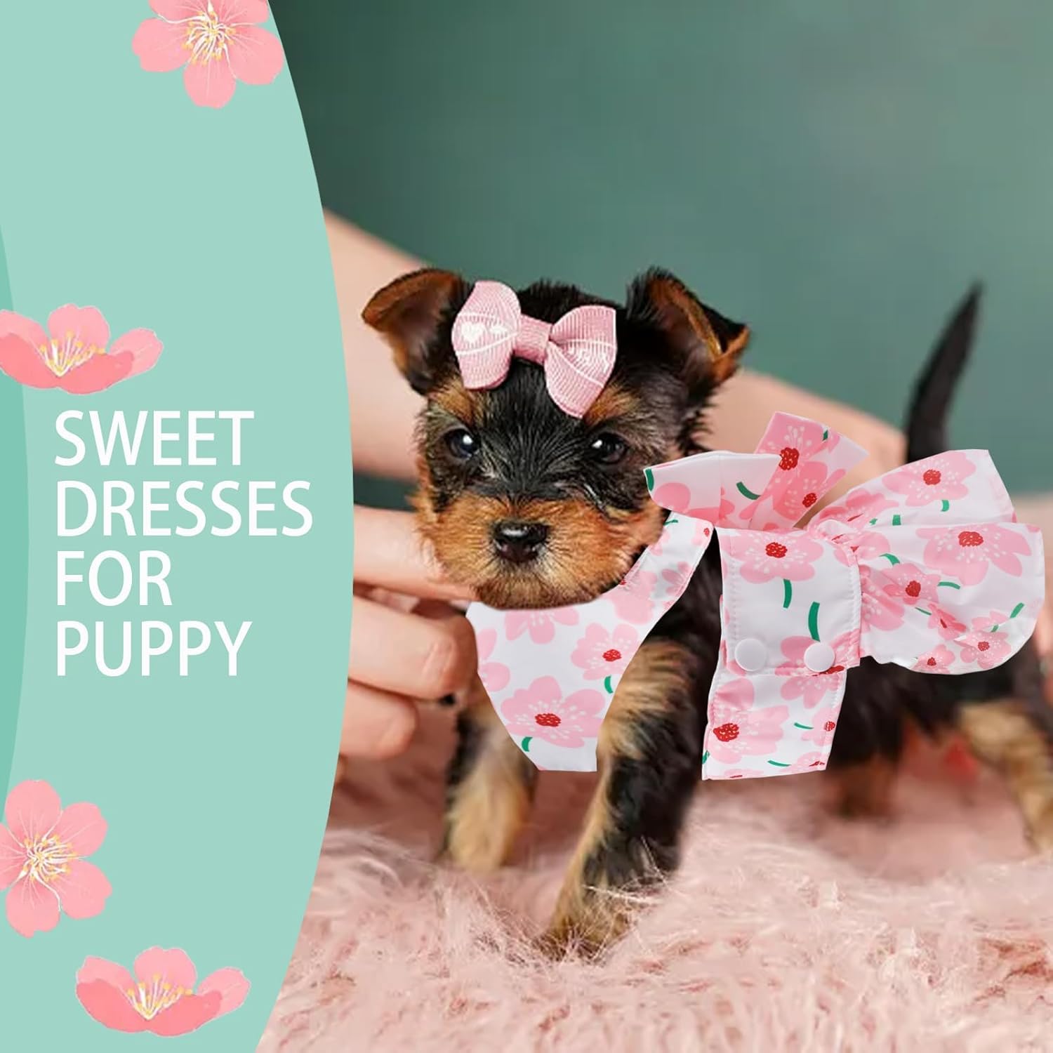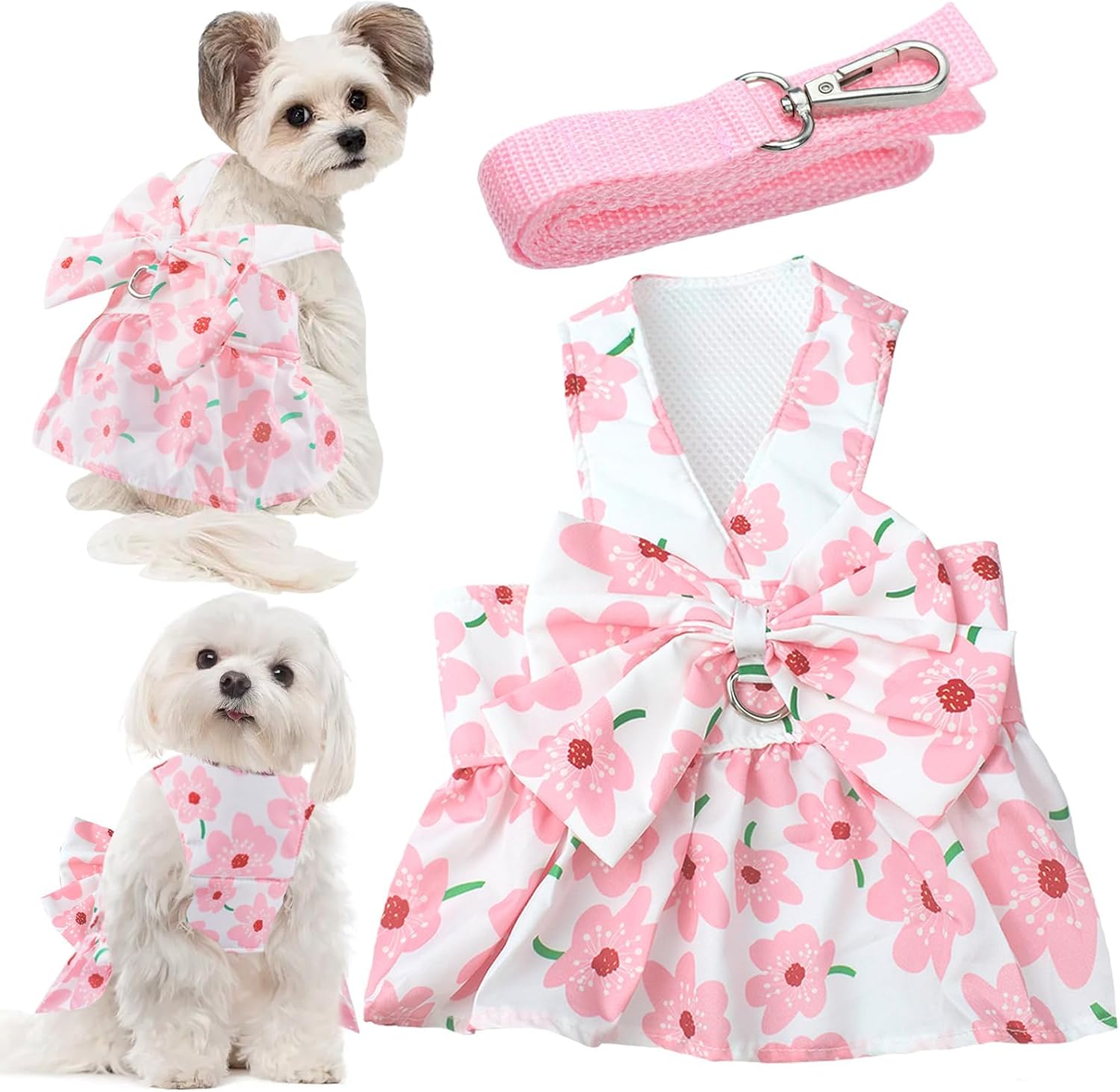 - [Cute Design & Appearances] The design of this dog dress is very sweet and cute, the pink peach blossom pattern is full of spring and summer nature, the white and pink combination looks fresh and bright, the waist of the dress is decorated with a bow, under the bow has a D-ring, which can quickly and easily secure the dog band. Its easy to use buckle, put on and take off the pet harness dress.