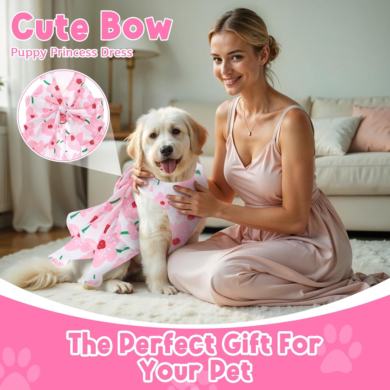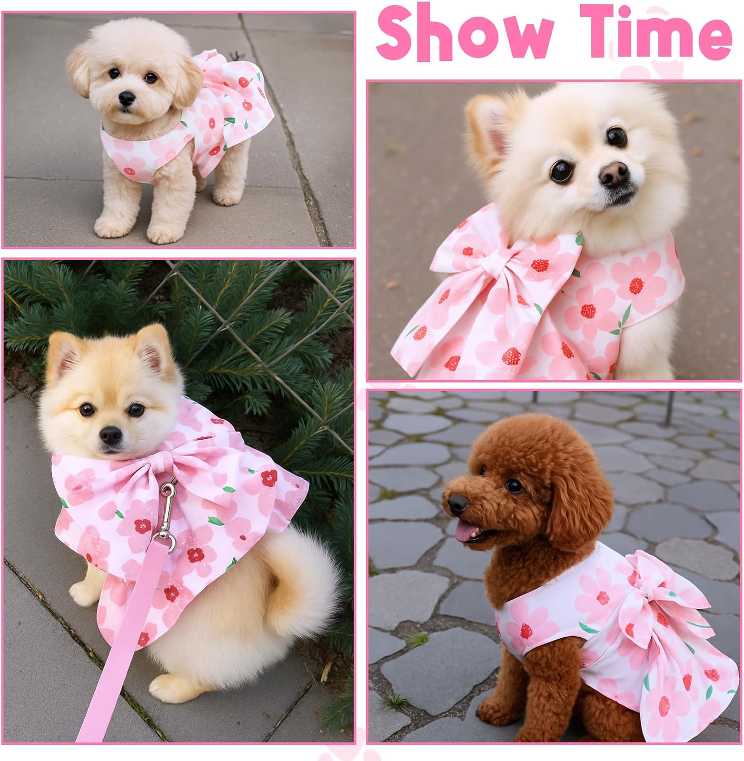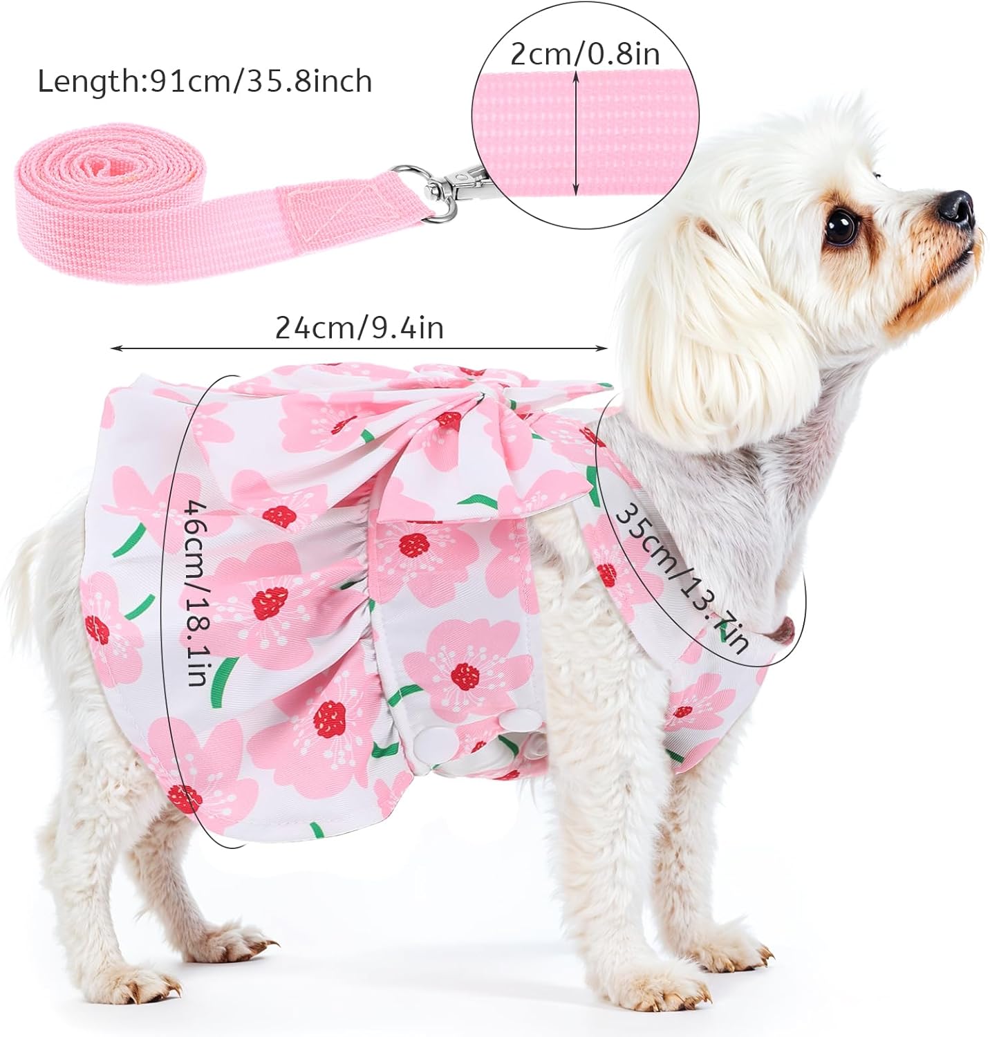 Packing List: 1pcs x Dog Dresses for Small Dogs Girl Specifications: Material: Polyester Color: Pink Product size: Bust Circumference: 35cm/13.7inch The Hem of Dress: 46cm/18.1inch The Length of Dress: 24cm/9.4inch Collar Leash Attachment: 91x2cm/35.8x0.8inch Features: 1. This pet dog dress features a bright pink floral pattern, making your pet stand out from the crowd. Each design is full of vitality and fun, perfectly showing the cuteness and unique charm of pets, suitable for taking photos or participating in various activities. 2. This dog dress is made of lightweight and breathable fabric, with a built-in mesh lining to improve air circulation, helping pets stay cool and comfortable, especially suitable for hot summer days. It can not only ensure that pets can wear comfortably all day, but also be easy to wash for daily care.