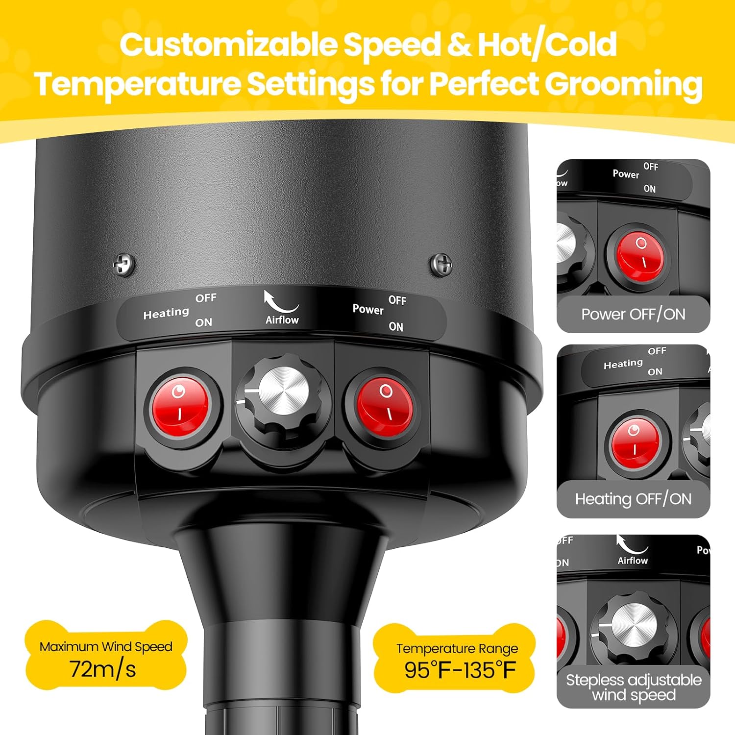 - Stepless Adjustable Speed & Temperature Control: With stepless adjustable wind speed reaching up to 72m/s, this dog dryer provides precise airflow control tailored to various grooming needs. It features a temperature range of 95℉-135℉ with hot and cold switches. The built-in temperature control system automatically shuts off the dryer if it overheats, ensuring safe use for all pets.