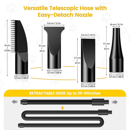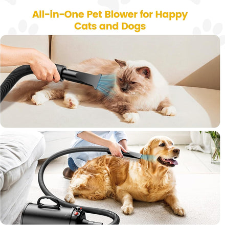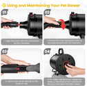 - Low Noise & Heat Insulation - Pet-Friendly: The thickened inner barrel reduces noise levels by 10-20 decibels compared to similar models and enhances heat insulation, making it safe for extended use. The insulated hose handle ensures comfortable handling, protecting your hands from heat during long grooming sessions.