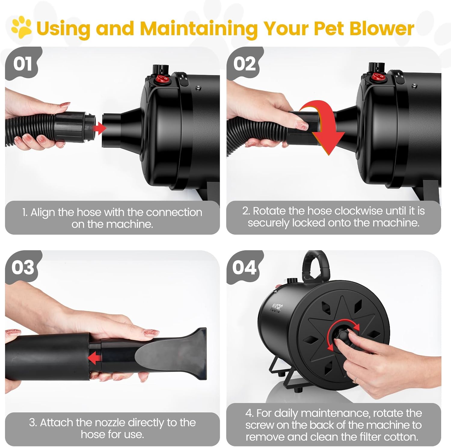 - New Upgrade - Quiet & Quick-Release Design: The AUORC pet dryer features the latest upgrades, including a thickened inner barrel that reduces noise and improves heat insulation, ensuring a quieter and safer grooming experience for sensitive pets. The new quick-release design allows for fast and secure connection to the main body, making nozzle changes and maintenance quick and efficient.
