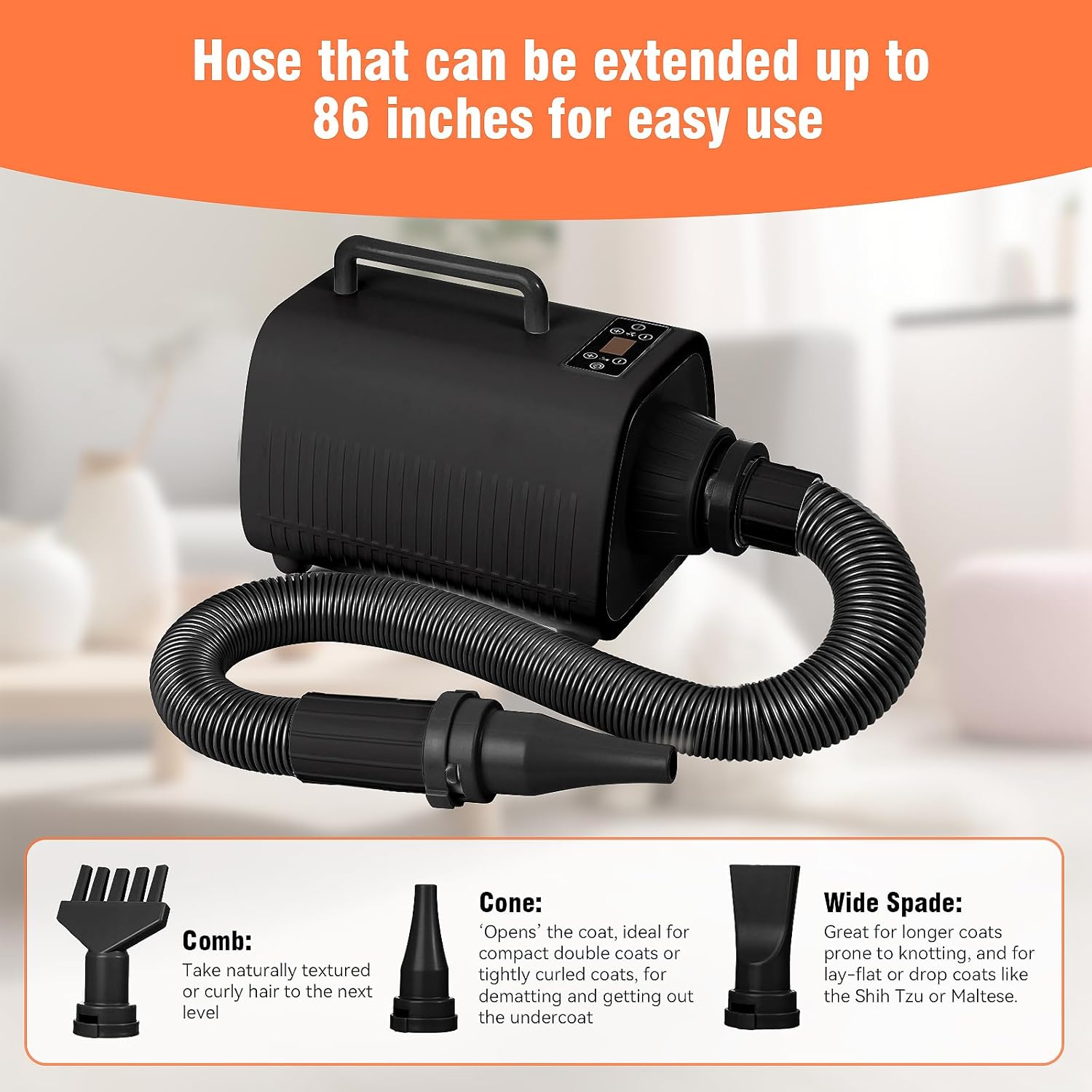- [Intelligent LED display] Our pet hair dryer is designed with an LED display, which is more convenient to operate, and displays the temperature and wind speed level of the dog hair dryer in real time. The intelligent LED display allows you to easily read and adjust the temperature and wind speed Settings, and bid farewell to the cold caused by the alternations of hot and cold for pets. Even in low light conditions, experience easy and convenient pet grooming with user-friendly buttons and switches that are easy to read and operate