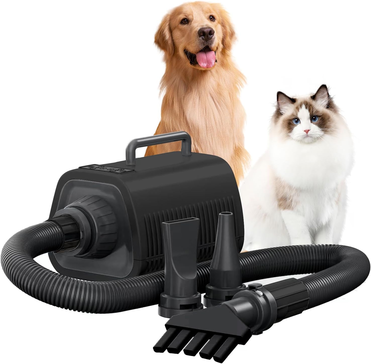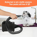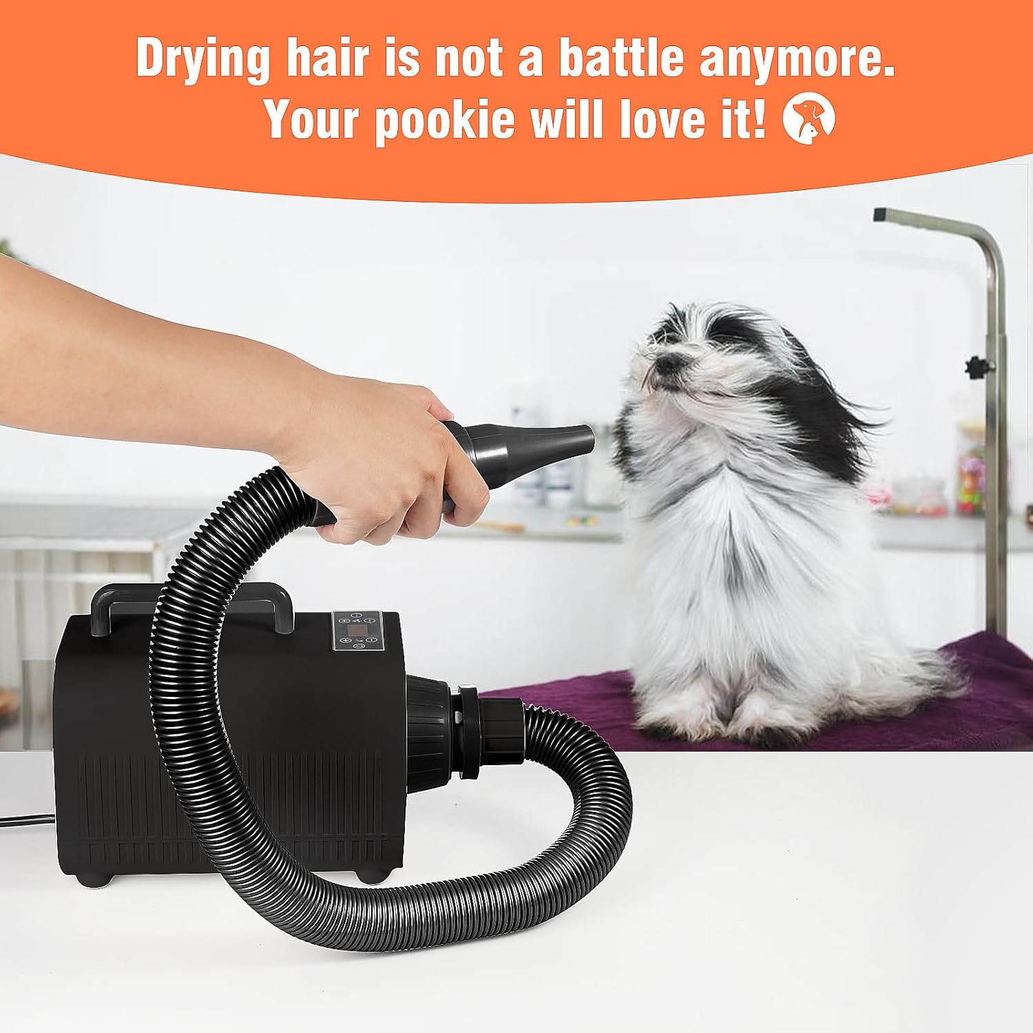 PEGNOY High power pet dryer is a professional pet hair dryer with high wind speed and fast heating function, wind speed 55MPH to 190 MPH, 9 adjustable, hair dryer outlet temperature is also 9 adjustable, can quickly dry pet dog hair after bathing, equipped with three nozzles and hose, product with low noise characteristics