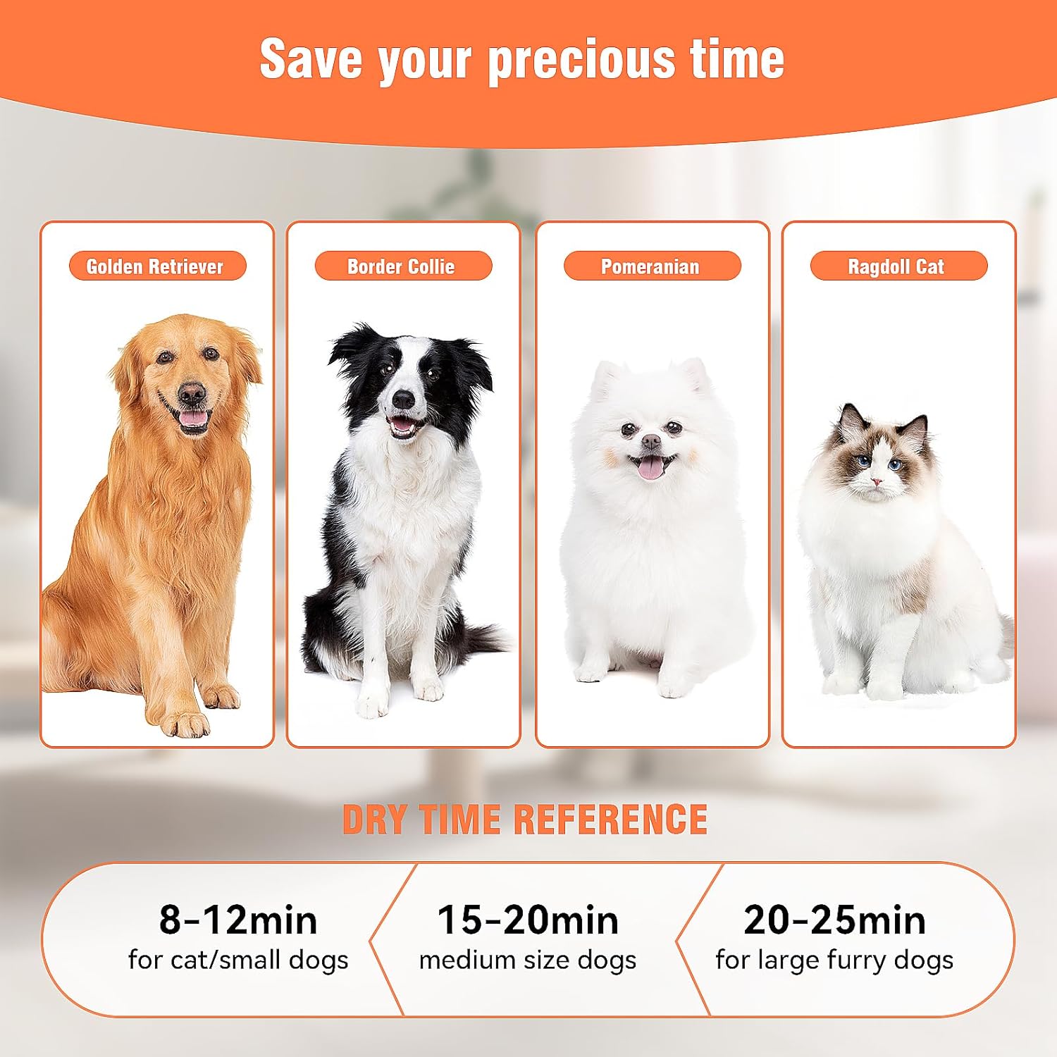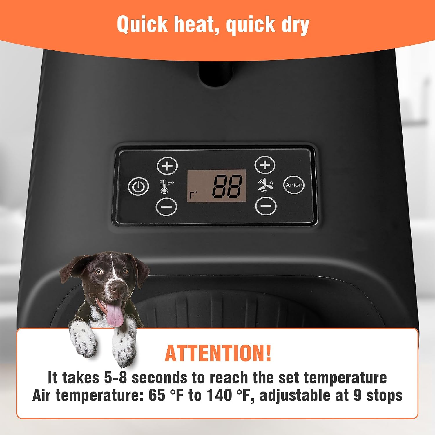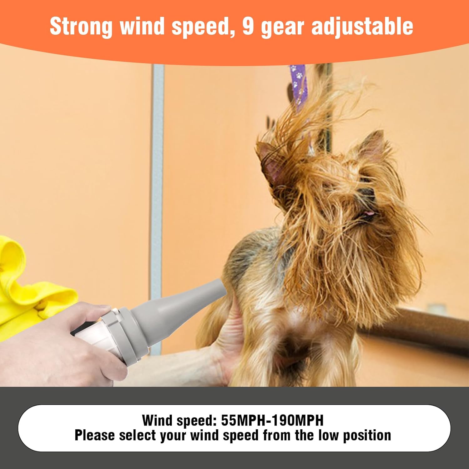 - [Adjustable wind speed and temperature] PEGNOY Dog dryer, robust and stable motor, equipped with multiple speeds and temperature levels, intelligent LED panel allows you to accurately control and adjust temperature and wind speed. Our pet hair dryers feature 9 adjustable wind speed and temperature Settings, wind speed: 55MPH-190MPH, temperature: 65℉-140℉. Depending on your various needs, pet hair dryers can also be used to dry your furniture, carpets, floors, etc