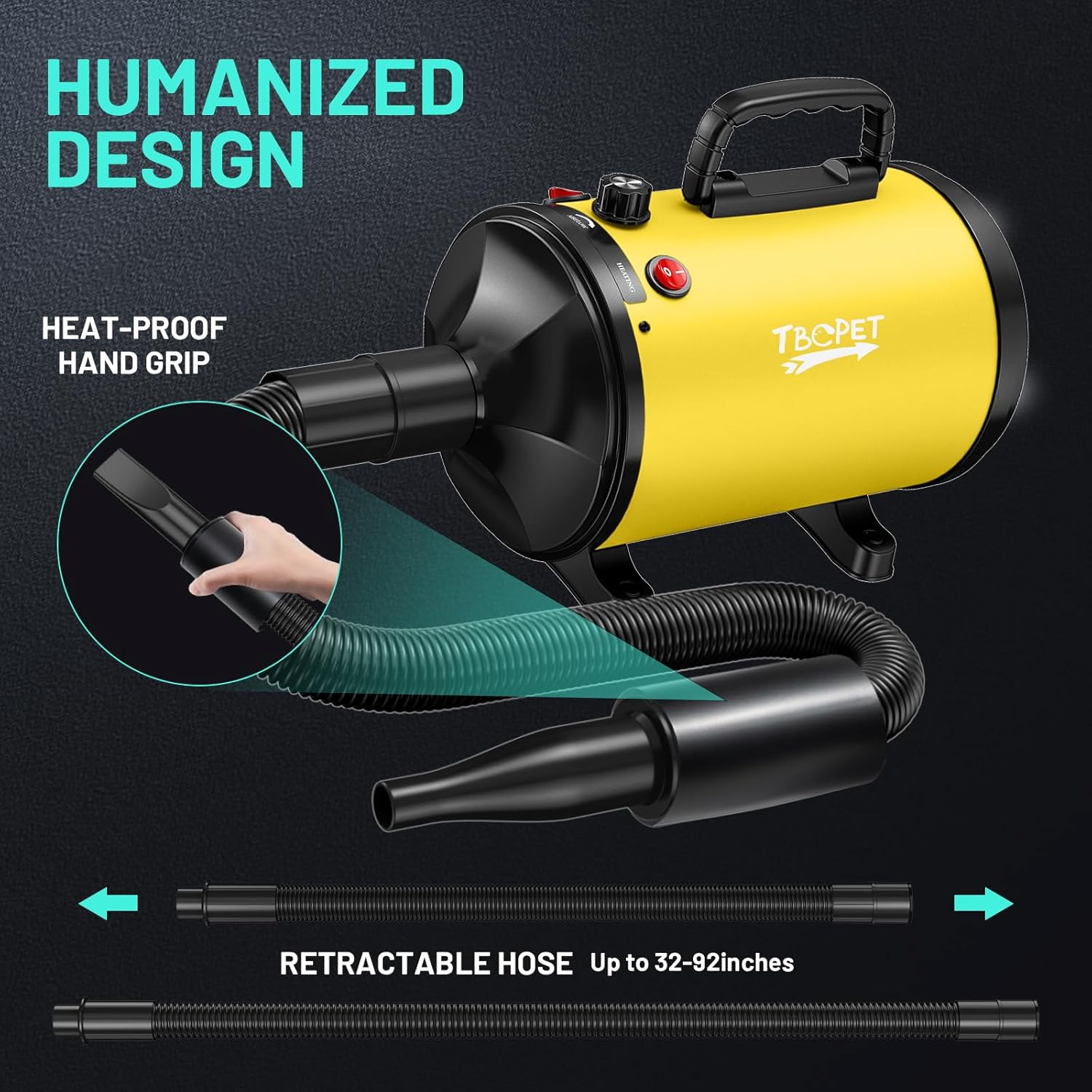 - [Versatile & Stable] Our pet hair dryer is designed for more than just grooming your pets; it is also great for drying your car, floors, and furniture. With a stable motor and adjustable speed and temperature settings, it offers ease of use and consistent performance.