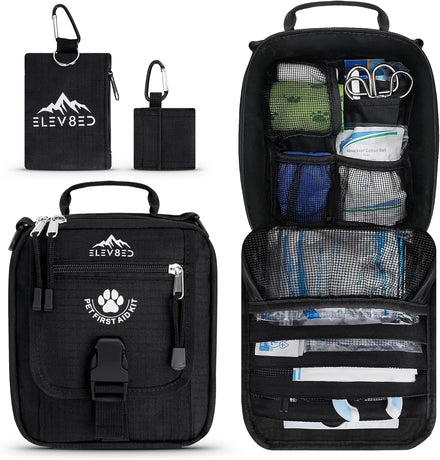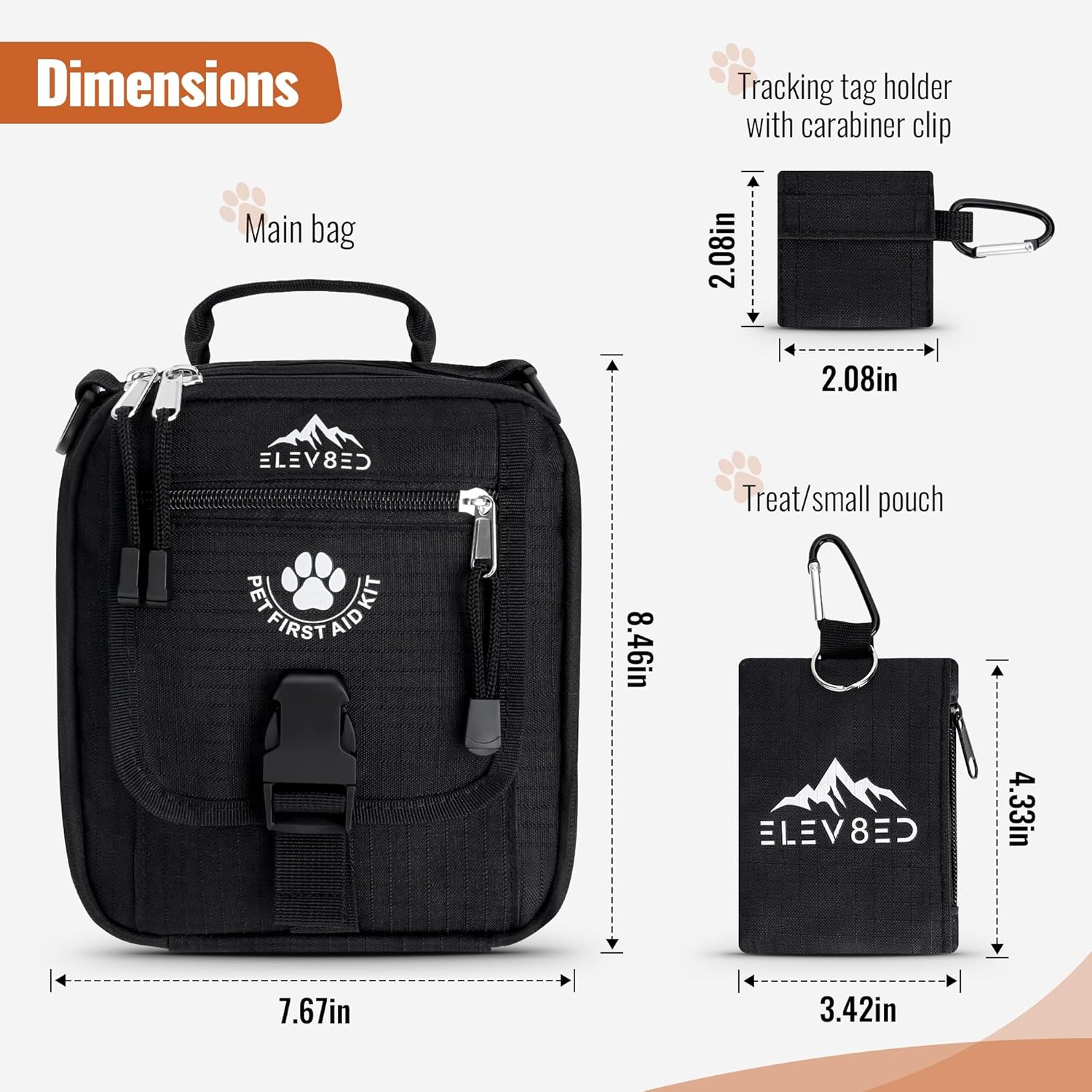 ELEV8ED is happy to serve you. We hope you enjoy our dog first aid kit! We have worked to provide the best product possible for our thousands of customers at a price that is fair to all. Dimensions of dog first aid kit. Our main bag is 22X18X14cm. What’s Included: Main bag with all the medical items, a smaller treat bag, and a small bag to hold a tracker. ⭐Perfect Pet First Aid Kit: Has everything you would have in a large first aid kit, but in a smaller hands free carrying bag, making it the ultimate adventure pet emergency kit. Can be used for canine first aid kits and a cat first aid kit. We also include a printed list of everything included with each kit! 🐾Safety For You And Your Animals: Our pet first aid kit for dogs and cats is assembled and organized with emergency first aid kit supplies that are specially designed for the pet owner and pet. Extra dog necessities included! 💪Lightweight And Strong: Perfect for travel and as dog accessories for camping. For the safety and survival of your pets, we make sure our products are built to last. 🎁Perfect Gift: Our dog emergency kit is the perfect gift for any animal lover. The pet emergency kit has had a large amount of thought put into what items it contains. You can rest assured the first aid pet kit is suitable for large or small animals like; puppies, dogs, cats, and more. ✅Promise To You: This dog first aid kit has our 100% satisfaction guarantee. If this product does not meet your expectations then it has not met ours either. We would be more than glad to replace or refund your purchase. Our goal is to provide you with a quality product that you would be proud to talk about.
