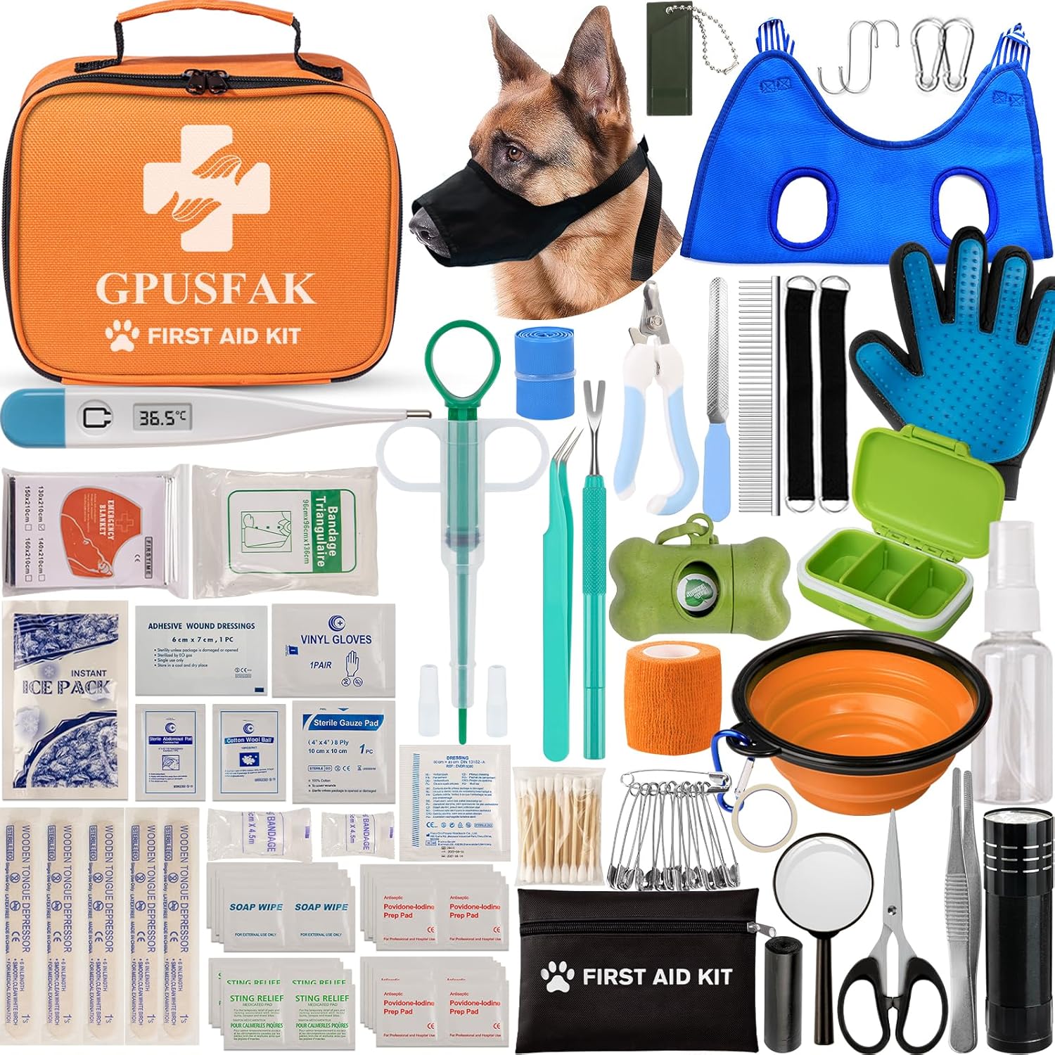 - A MUST-HAVE FIRST AID KIT FOR PETS --- Do you have an active pet such as dog or cat? Then you definitely need this pet first aid kit. It contains FIRST AID SUPPLIES including gloves, bandages, self adhesive vet tape, tweezers, scissors... and USUAL CARE SUPPLIES like pet pill feeder kit, microfiber towel and magnifier, etc