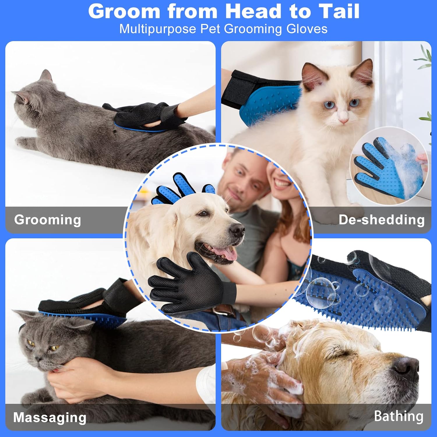 - GROOMING GLOVES & POOPER SCOOPER--- Pet grooming gloves brush off dust and loose hair from your pet without painful removal of hair or scratching of skin. 2 pet gloves (1 left hand and 1 right hand) have adjustable wrist straps for the comfort of all. Pooper scooper have long and comfortable handle of the potty picker keeps your face, hands and nose away from dirt and odors