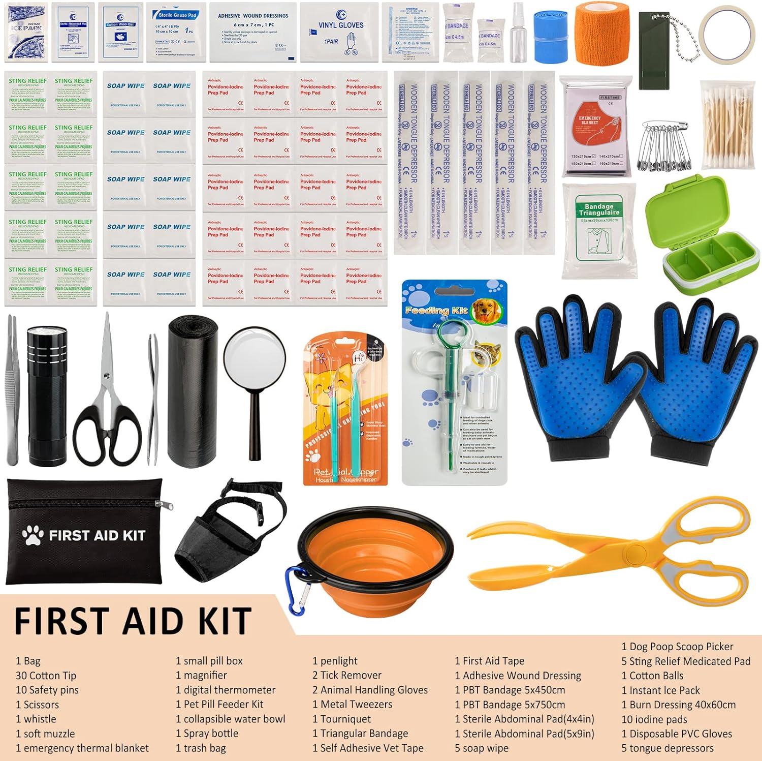 - MEET YOUR BASIC NEEDS --- With this kit, you can do the emergency care and daily pet care such as wound care and feeding medicine. In addition, we add 1 empty spray bottle, 1 small pill box, 1 collapsible water bowl and 1 trash bag in the package, you can also put what you need in it