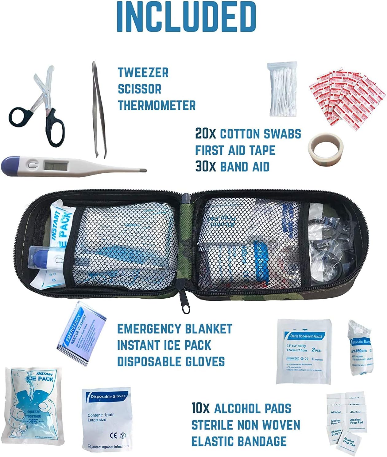 - HIGH QUALITY DOG FIRST AID KIT: Deluxe Dog First Aid Kit was planned and designed with the contribution from pet owners with more than 50 combined years of experience. Our pack contains the things you need to be prepared for your pet's injuries they got while climbing, at the puppy park, tracing, hiking and hunting, or inappropriate eating. The electric thermometer is a must to know the severity of the situation.