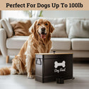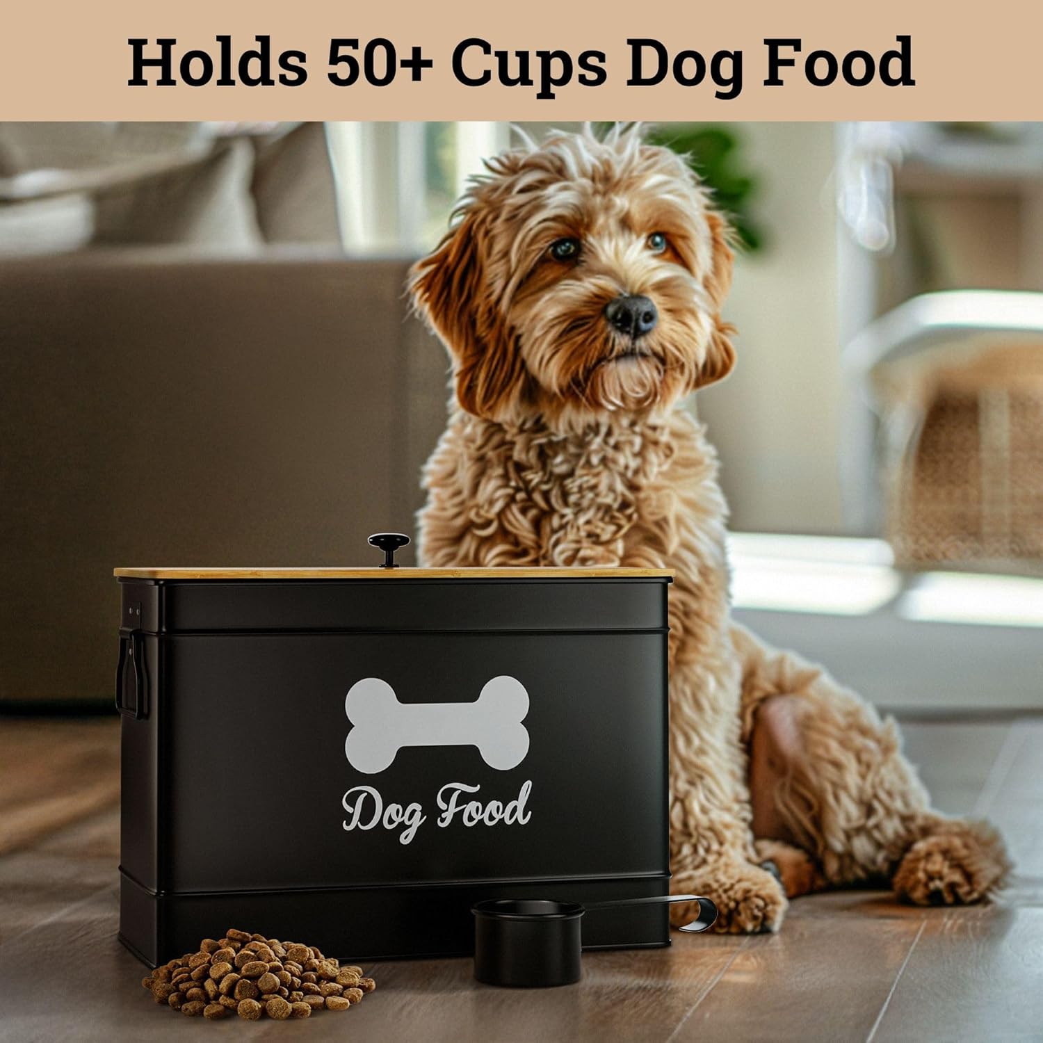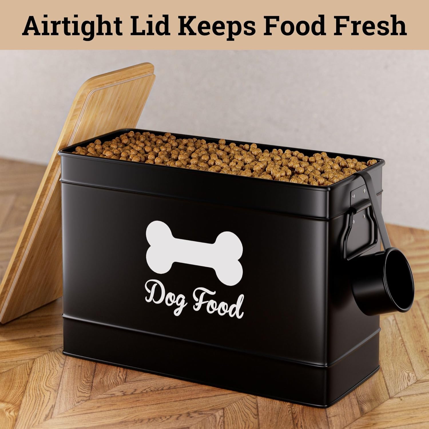 - DECORATIVE & FUNCTIONAL - Designed for display with a sleek matte black powder coated finish and stylish bamboo lid, this decorative dog food container matches any décor. Made of iron, this metal dog food container is light and not breakable, but sturdy and designed to last, as well as being easy to hand wash.