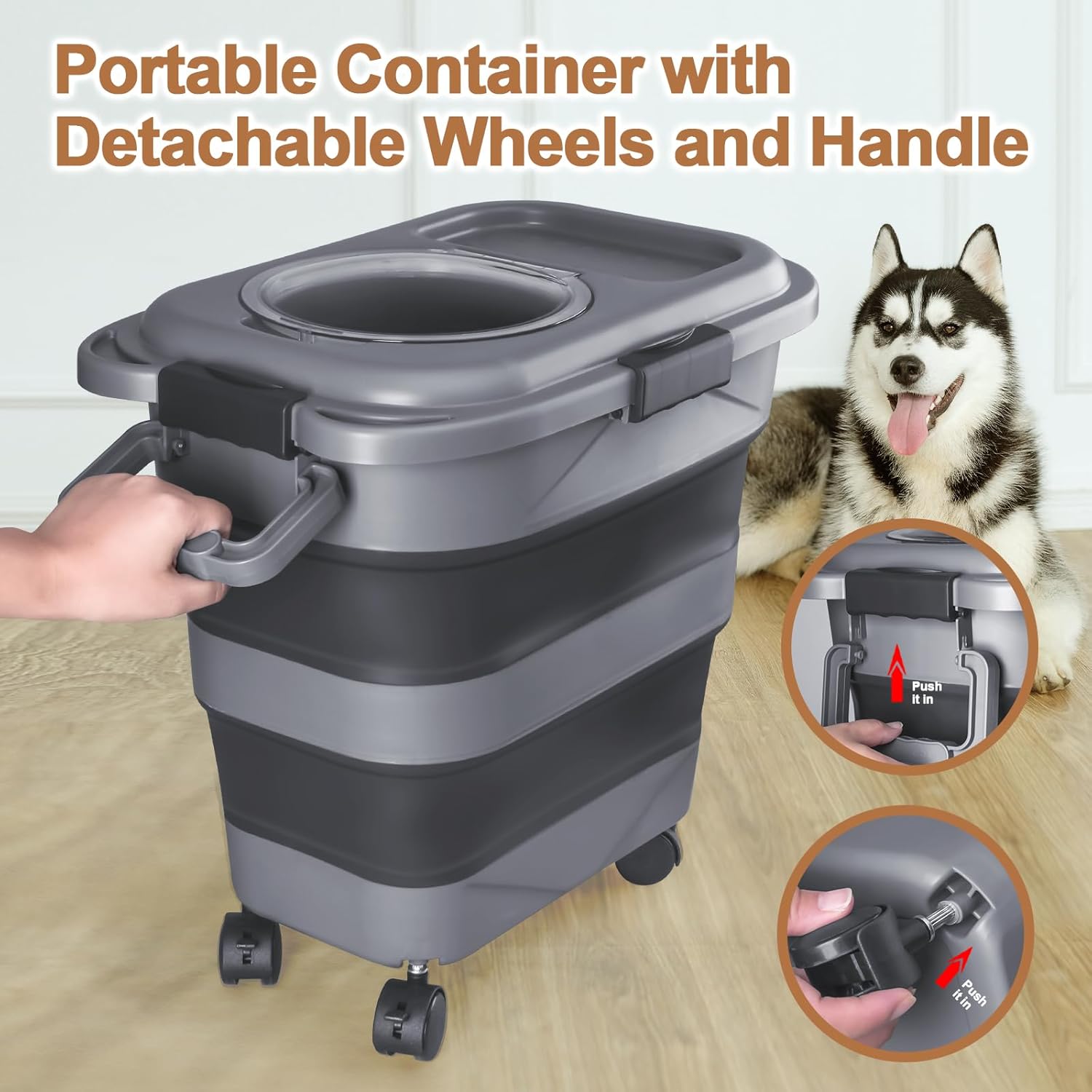 - Built-in Detachable Handle & Wheels: This Upgraded Cat Food Container is with large handle. It’s easy to move around or you can hang it up to save space. Great for travel! You can also remove the wheels and put it on a shelf or cabinet