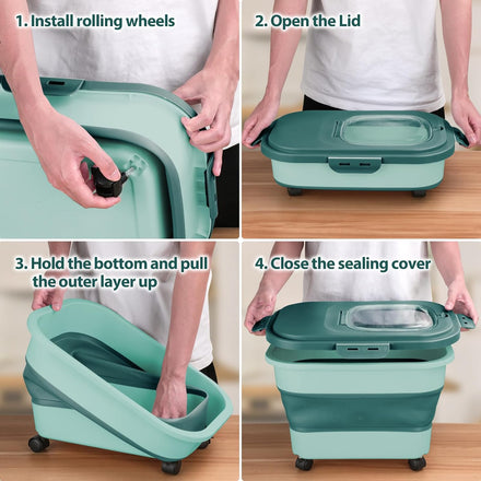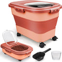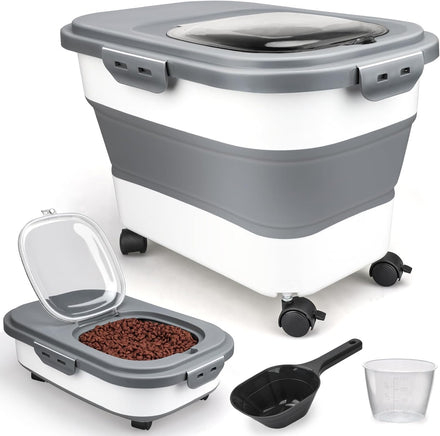 - UNIQUE VARIED SIZE DESIGN: This dog food container is designed to be collapsible that can be adjusted the size as you need. When unfolded, it can hold about 20lbs of dog food or 30lbs of rice. When folded, it can hold about 6lbs of dog food or 10lbs rice. You can collapse and store it when food is low