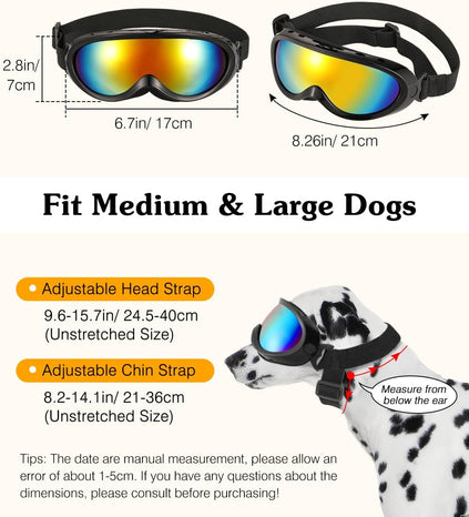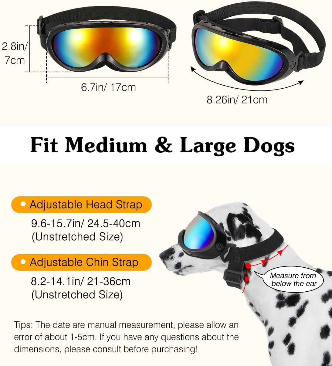 - 【For Medium Large Dogs】Size of dog goggles large breed: 6.7x2.8in/ 17x7cm. Suitable head circumference: 9.6-15.7in/ 24.5-40cm. Suitable jaw circumference: 8.2-14.1in/ 21-36cm. Our dog eye goggles are designed for large dogs, such as German Shepherd, Rottweiler, Golden Retriever, Alaskan Sled Dog, Bernese Mountain Dog, Husky, Labrador and so on. (Note: Please measure your dog's head, jaw size, and eye-nose distance before getting our dog sunglasses.)