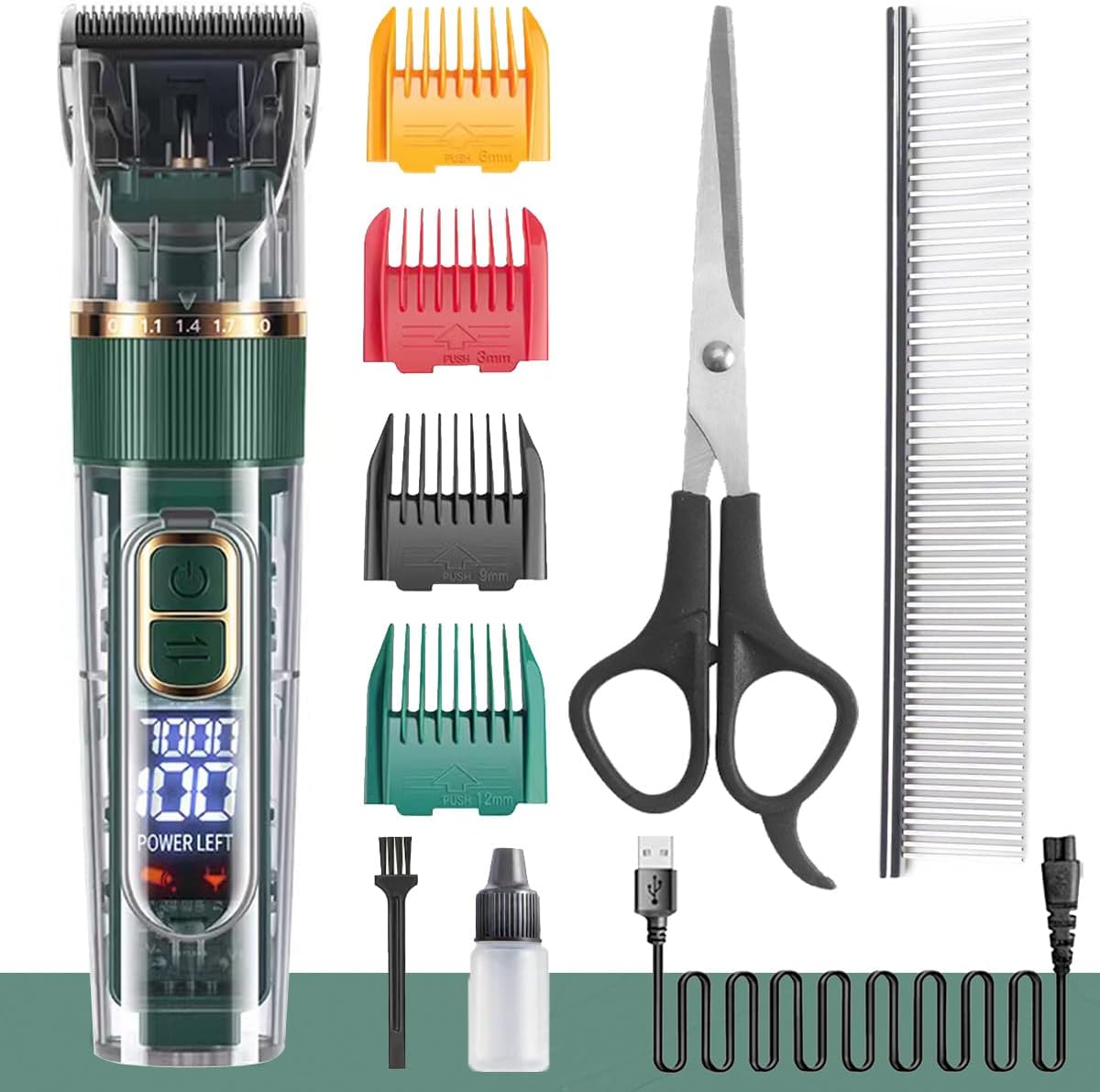 - Superior performance:2000 mA Long battery life and 5000-7000 rpm powerful motor provide extended periods of grooming time, allowing for even the thickest and toughest of fur to be easily trimmed or shaved.4pcs guard combs(3mm/6mm/9mm/12mm). Knob to adjust blade length,(0.8mm/1.1mm/1.4mm/1.7mm/2.0mm)The adjustable clipping comb is applicable for clipping hair of different lengths; and the detachable guide combs make for quick, easy comb changes and increased versatility.