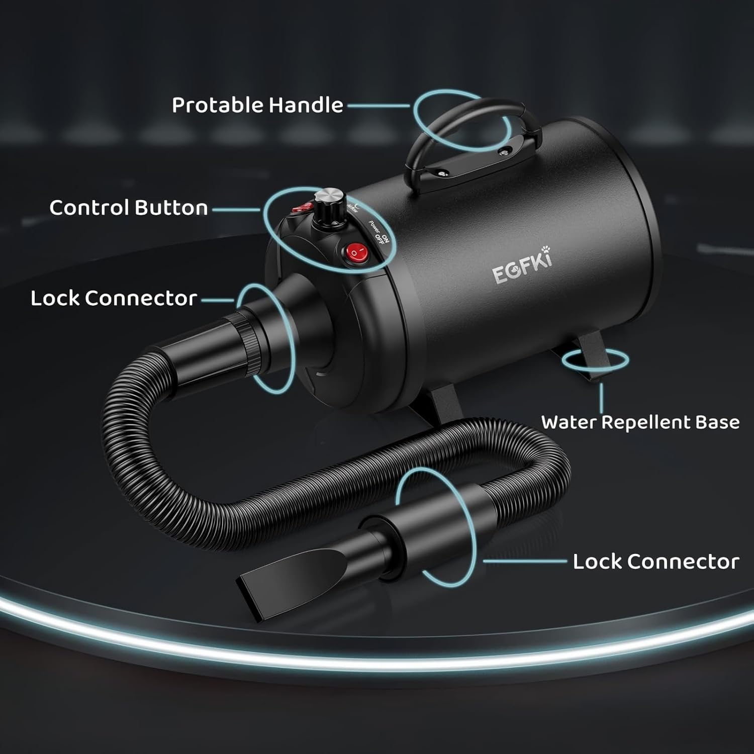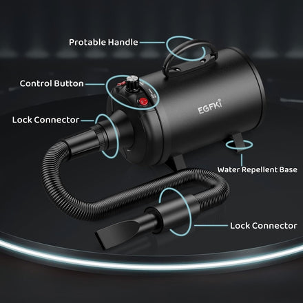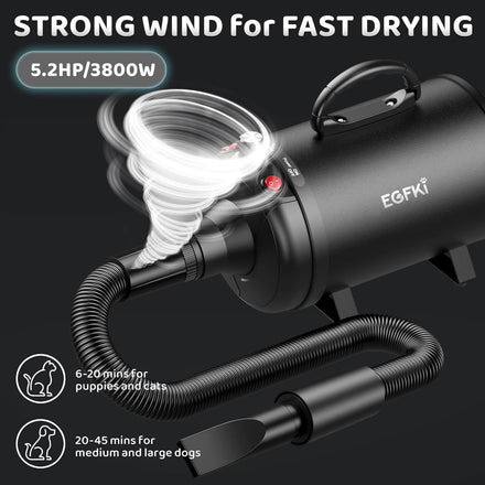 - Strong Blow Force: The power of this dog hair dryer is 5.2 HP/3800 watts. The strong blow force enables the dog hair dryer to dry the thick dog hair, remove loose dog hair, dirt,and scurf, making the dog hair more smooth and shiny to achieve the beauty effect of pet grooming shop.