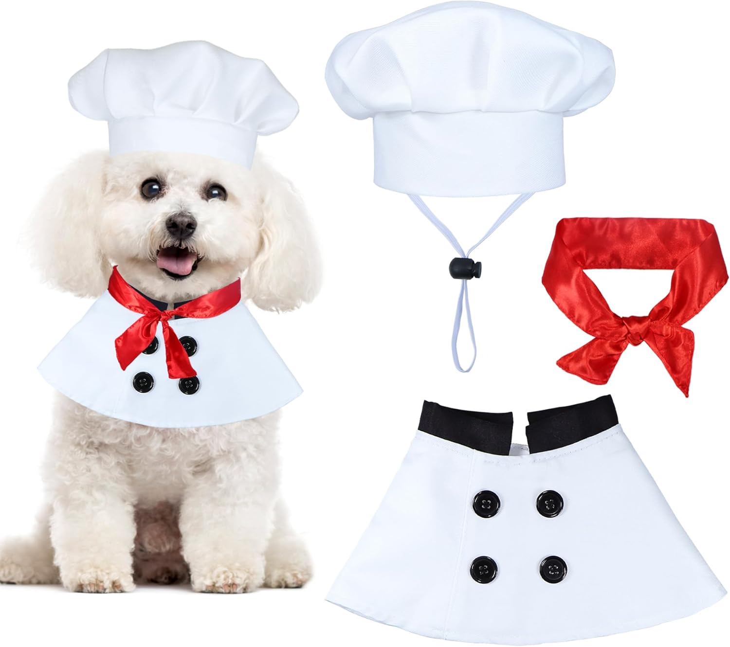 - Dog Halloween Chef Costumes: This dog chef costume contains 1 dog chef hat, 1 dog chef clothes and 1 dog red scarf. The cute dog costumes for Halloween will decorate your dog as a little chef and bring some laugh on Halloween.