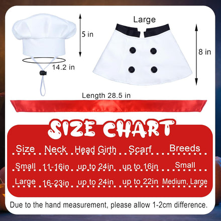 - Two Sizes Design:The dog chef hat is about 4.7” in diameter and 4” in height. The large dog chef clothes will fit dog neck size from 16” to 23” . The large dog red scarf fits neck size up to 22”. We also have a small size dog chef clothes for your pet neck size from 11” to 16”. The small dog red scarf fit neck size up to 16”. Please check your dog size before ordering.