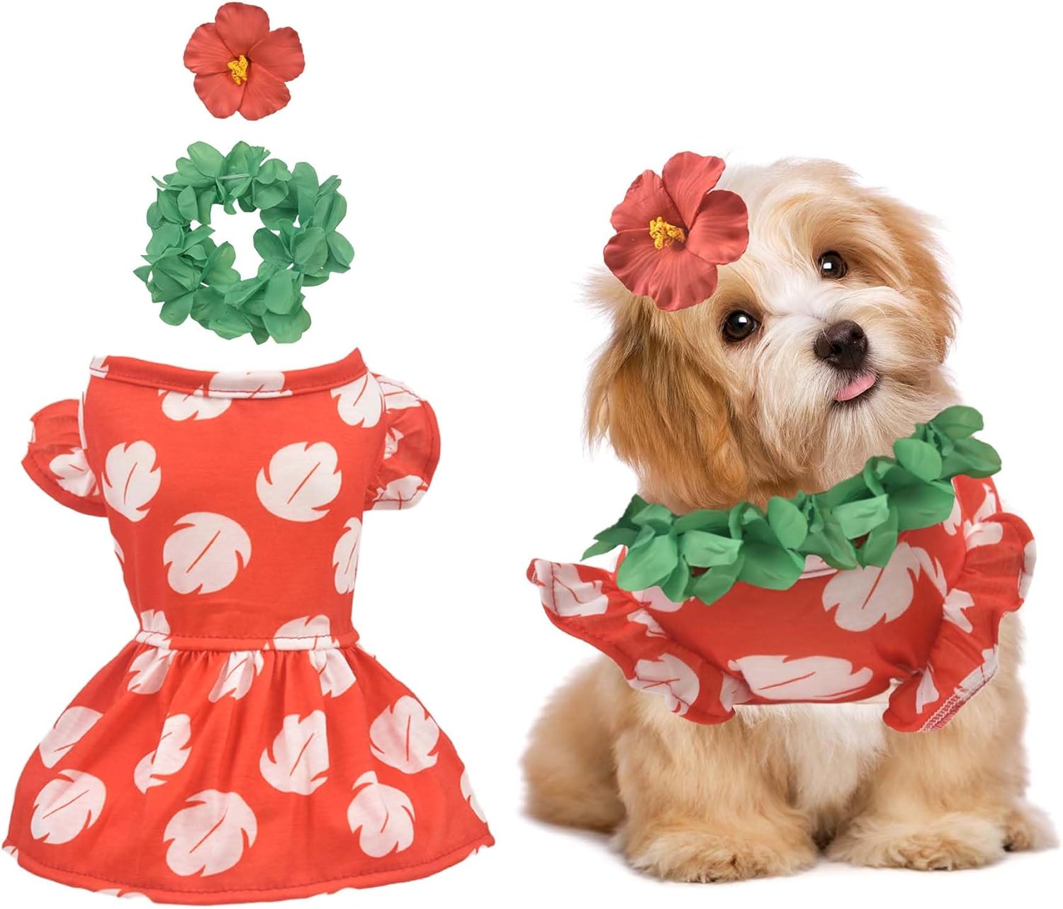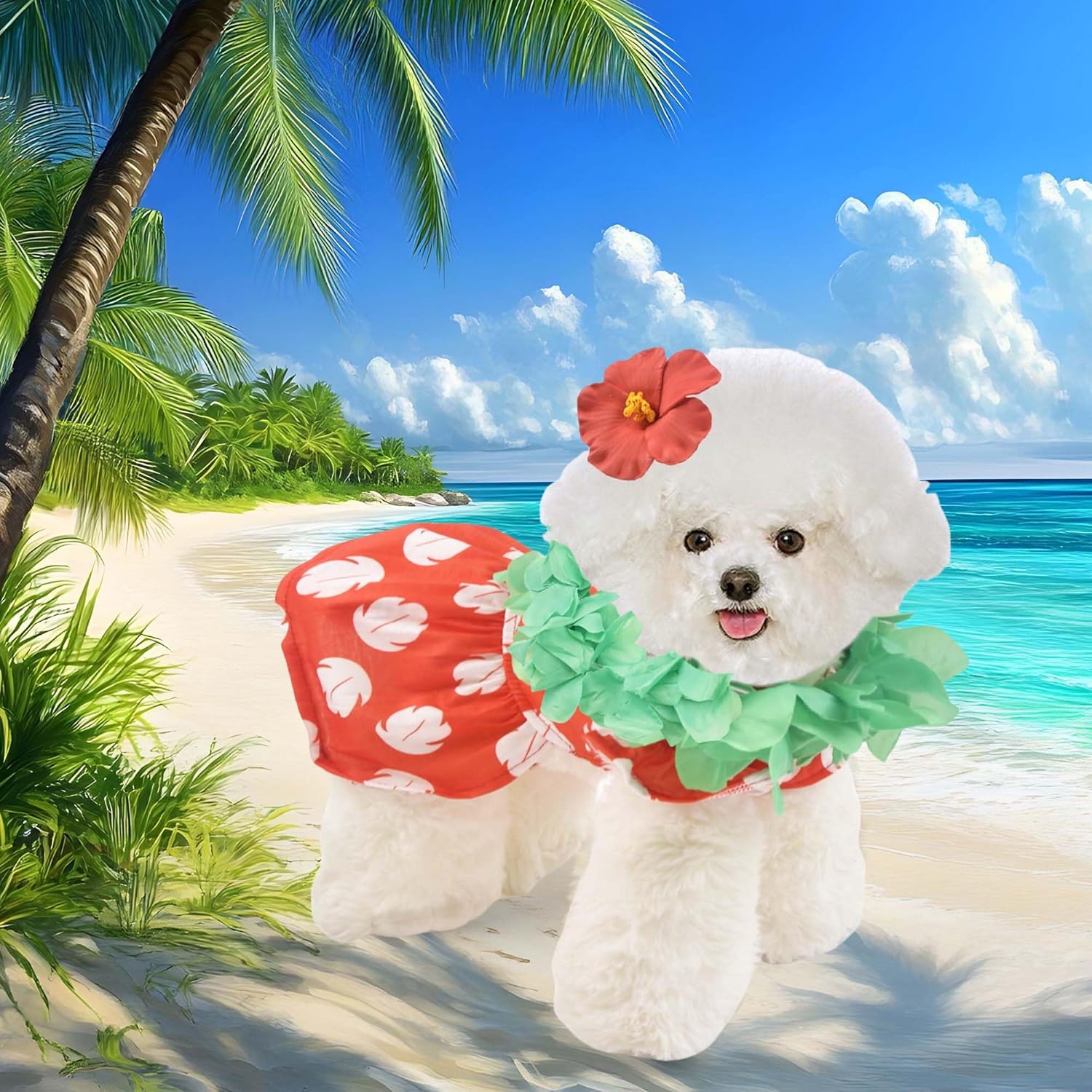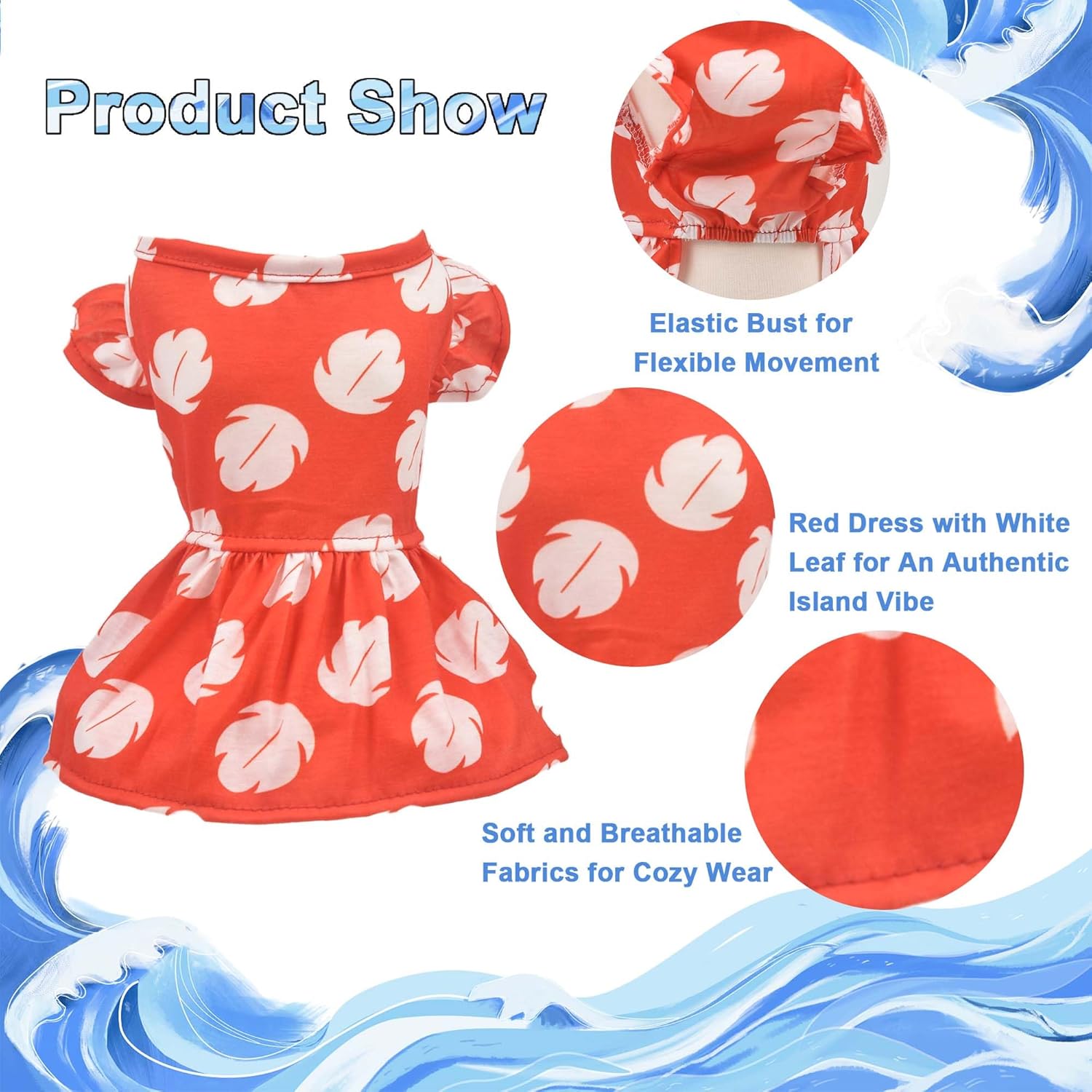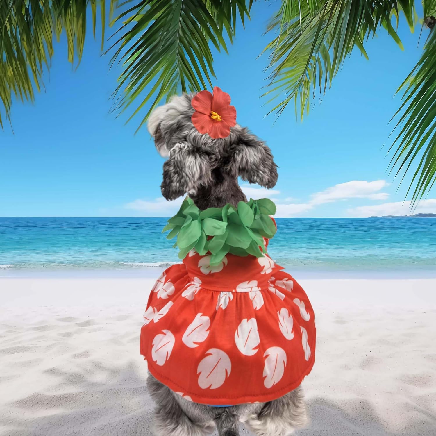 - Hawaiian style:Dress your furry friend in this vibrant Hawaiian-style dog dress, inspired by the cheerful spirit of a beloved tropical movie character. This eye-catching outfit features a bold red dress with white leaf prints for an authentic island vibe, paired with a matching flower lei necklace and two blossom bracelets (perfect for paws or human wrists—ideal for duo cosplay!)