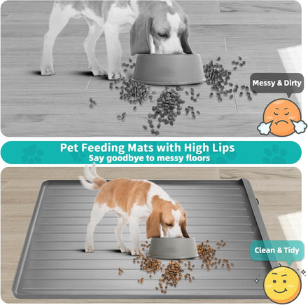 - WATERPROOF AND EASY TO STORE: Our dog food mat is made of high quality silicone material that is 100% waterproof, and is easily dried with a damp rag or rinsed with water. It also does not leave any water marks after drying. The silicone dog food mats are soft, flexible, and can be folded or rolled up to save space. The hook design allows for easy hanging to dry after washing, keeping the mat clean and dry at all times.