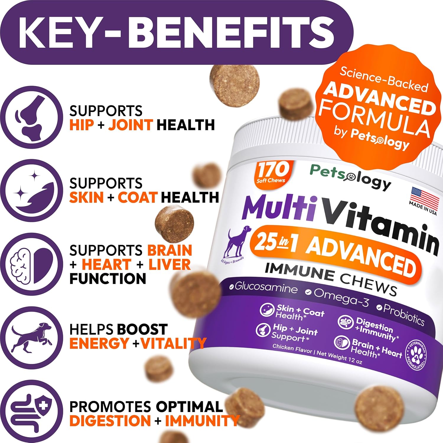 - 25-IN-1 Comprehensive Dog Multivitamin: Our pet vitamins and supplements provide essential nutrients to support overall wellness, including joints, digestion, skin, gut, immunity and heart health.