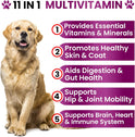 - 11 in 1 Dog Multivitamin: With an innovative formula based on 6 probiotics, Omega-3 rich salmon oil, glucosamine and other essential vitamins and minerals, this vitamins for dogs large breed is the perfect choice for promoting your pet’s wellbeing!