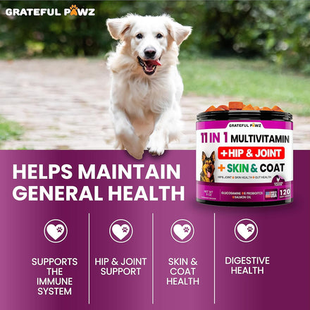 - Hip and Joint Support: The Grateful Pawz natural dog vitamins multivitamin can help reduce joint inflammation and rigidity, allowing your dog to enjoy enhanced mobility and flexibility by increasing lubrication.