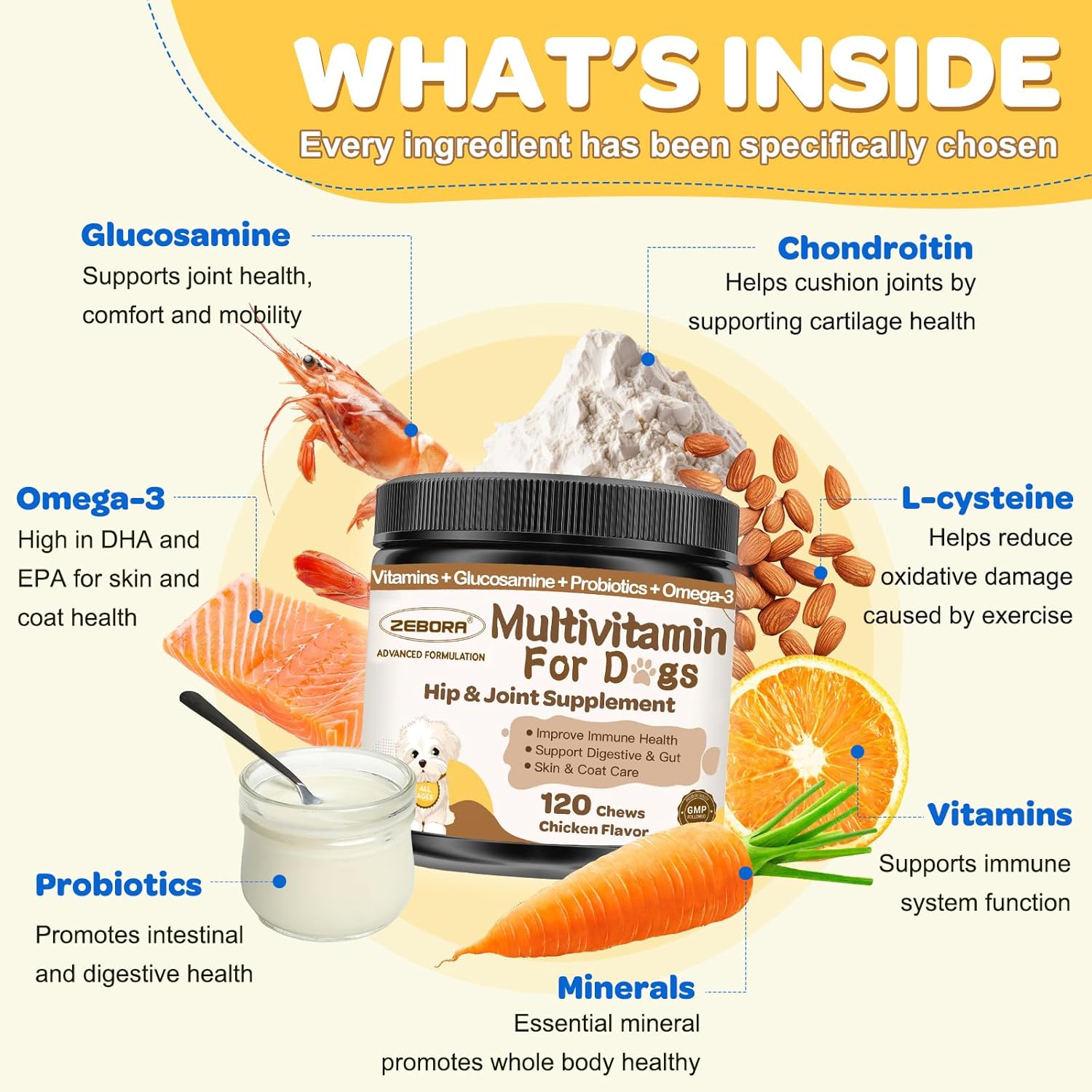 - HUMAN-GRADE MULTIVITAMIN: ZEBORA dog multivitamins chewable contains vitamins, minerals, antioxidants, omega 3 fatty acids, glucosamine, chondroitin and 1 billion CFU of probiotics that support your pet's health balance and help them in peak condition