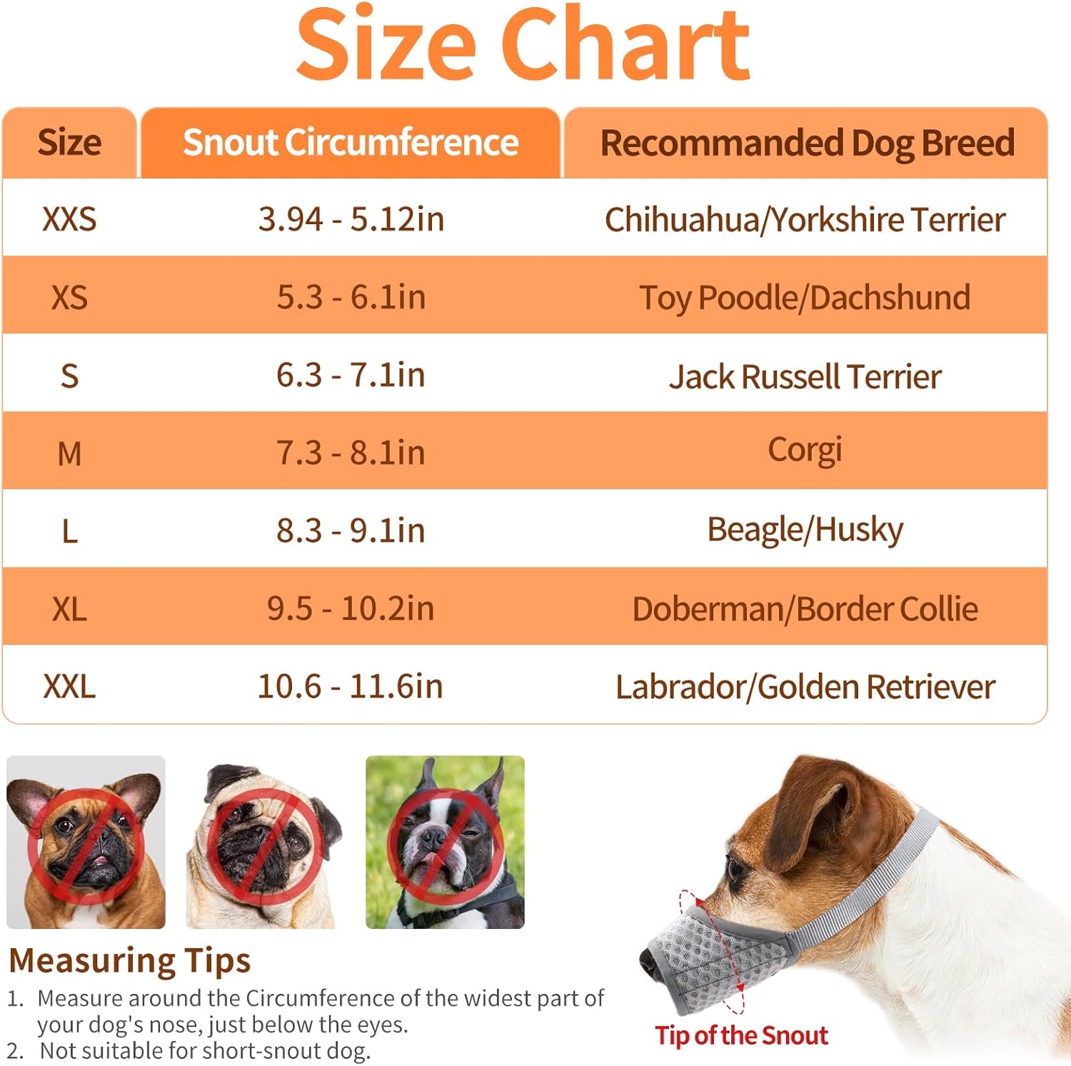 - Sizing Guide: Dog mouth guard is specifically designed for long-snout breeds. To ensure a proper fit, measure the circumference of your dog's snout 2 cm below the nostrils and the width of the head behind the ears before placing an order. Please note that this dog mouth cover isn't suitable for short - snouted breeds like Bulldogs, Boston Terriers, Pugs, and Boxers.