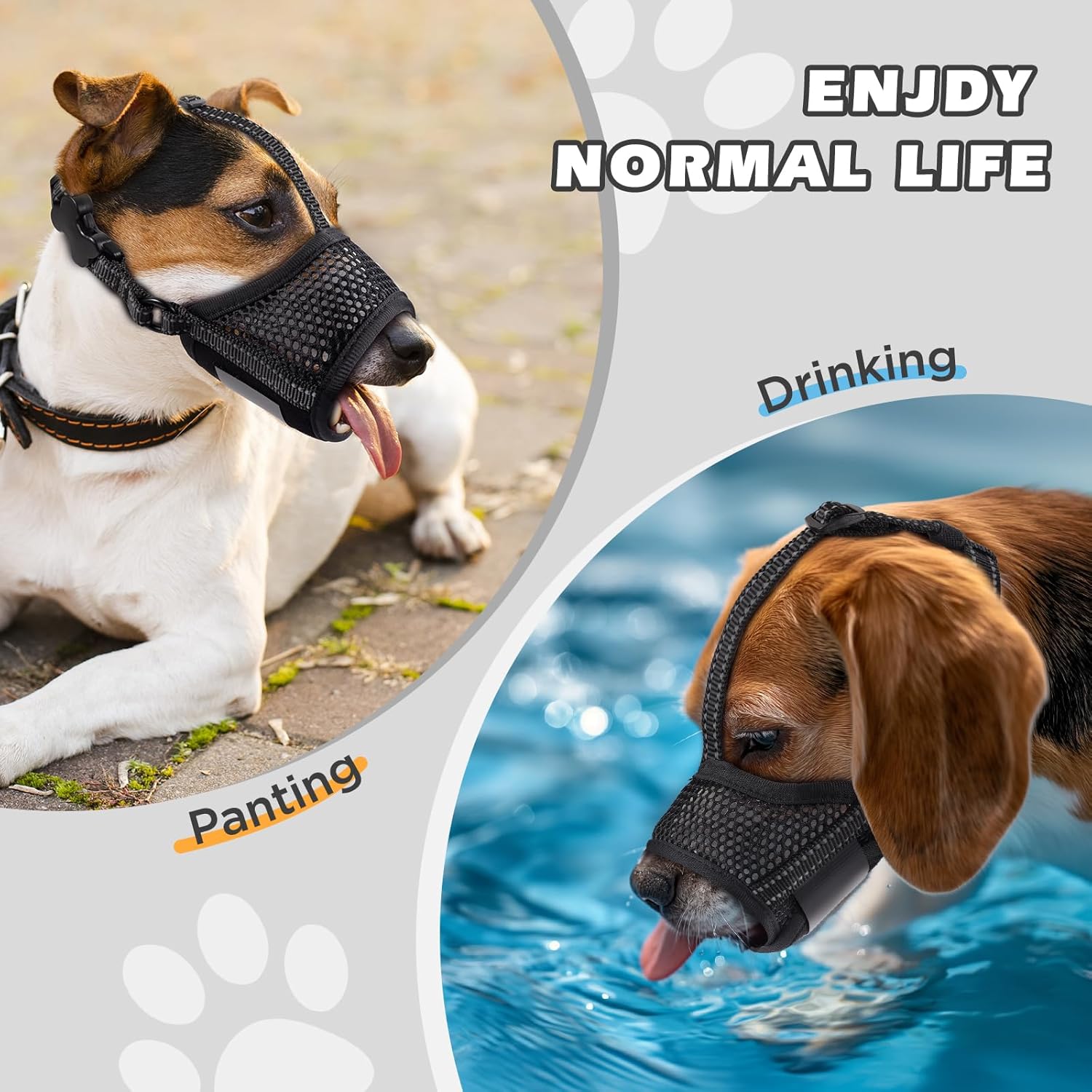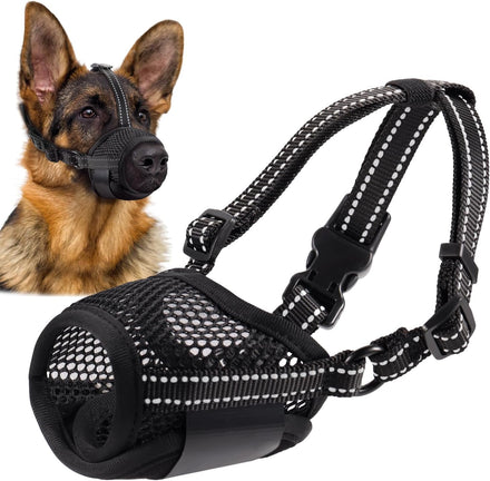 - Safety &Adjustable Dog Muzzle: Adjustable at snout and overhead strap. Keep the dog mask muzzle stays in place. Dont worry about your dog wriggling out of their dog mouth cover!.The reflective edges is safety for walking in dark.Please don't let your dog wear the muzzle for a long time without your supervision.
