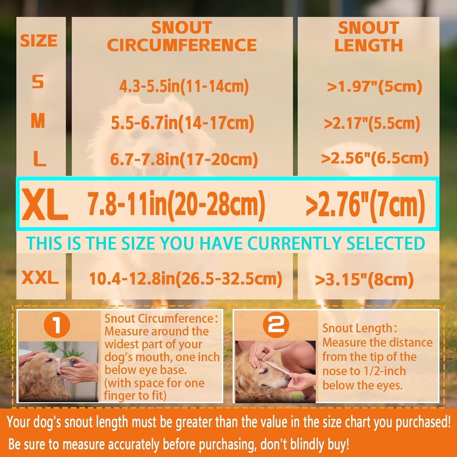 - 【Size Options: XL(Circumference:7.8''-11''in)】: This option is suitable for LARGE-SIZED dogs, for example: German Shepherd Labrador/Golden Retriever, etc, Please make sure to measure according to the size chart in the display picture before purchasing, and most important is your dog's snout length must be greater than the value in the size chart you purchased! (In this option, your dog's snout length must be greater than 7cm)