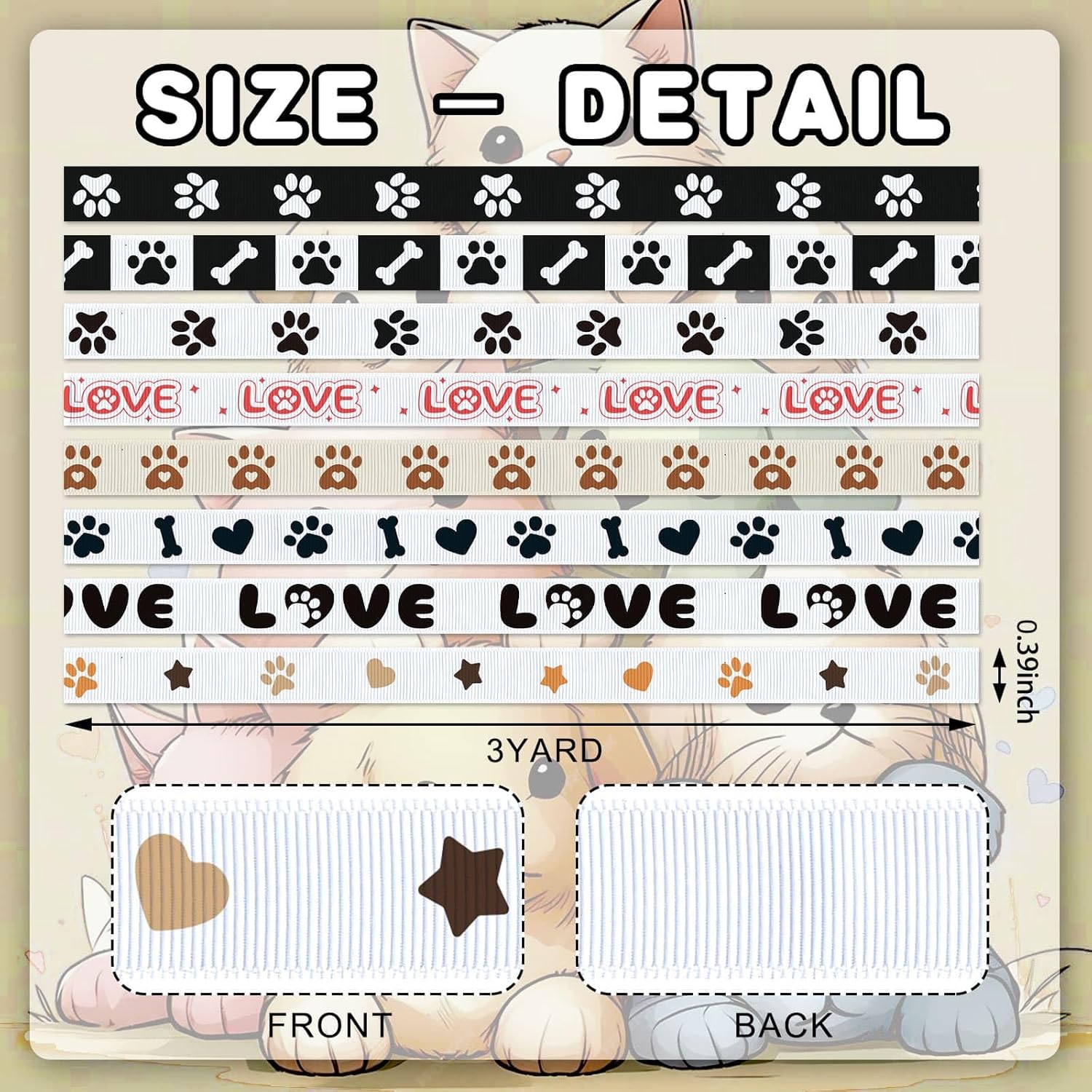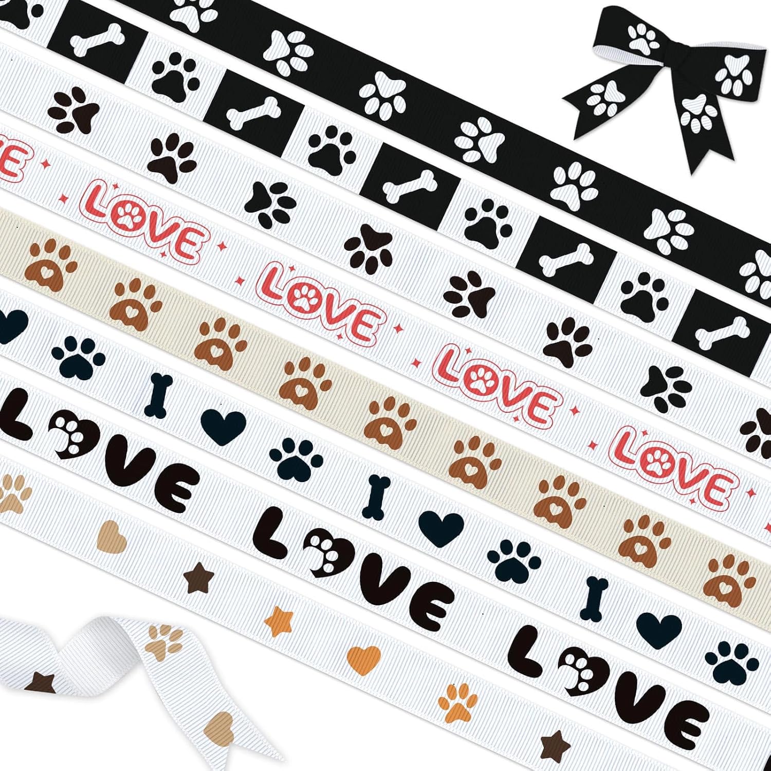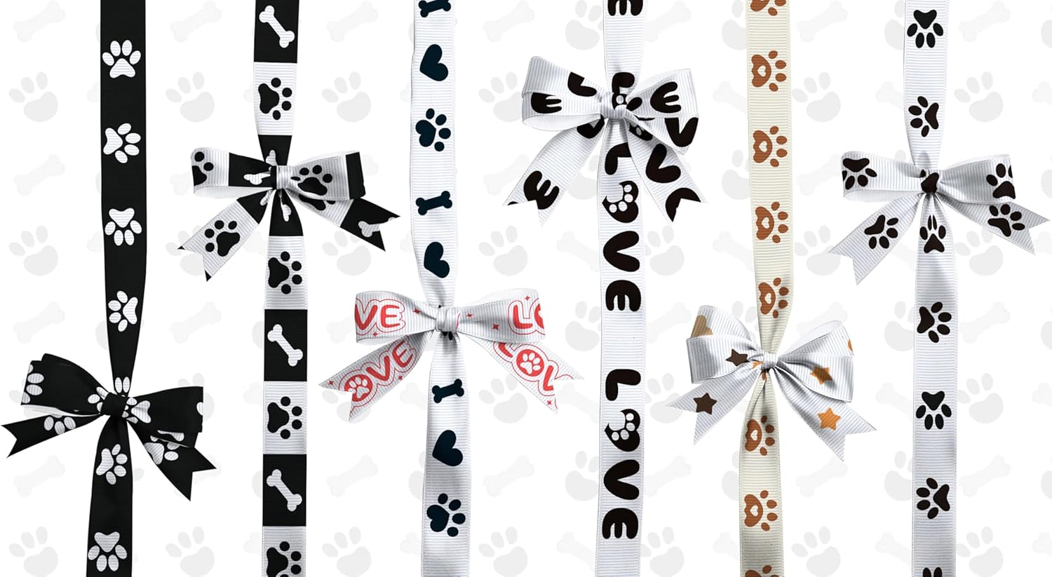 - Delightful Pet Pattern Set: 8 unique dog paw and bone designs featuring black white and pink love prints across 3 yards of premium ribbon perfect for pet lovers