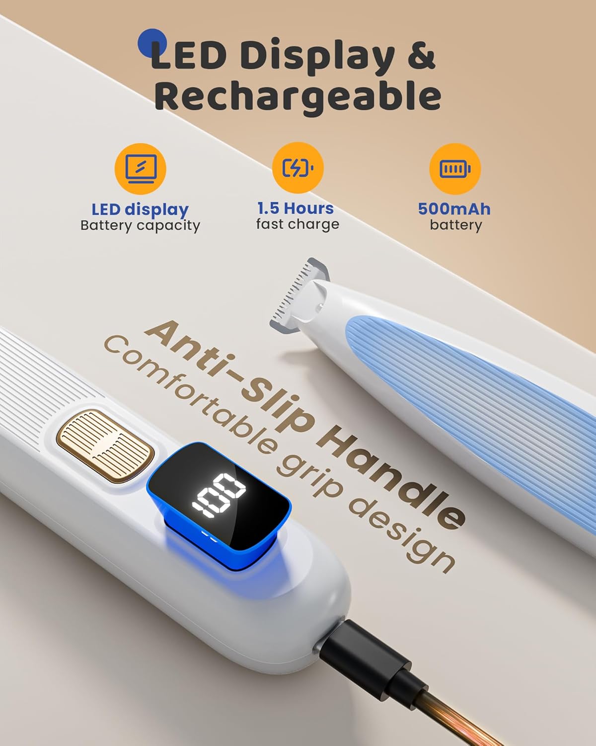 - 【LED Display & Rechargeable】:This dog paw trimmer is equipped with a smart LED screen that clearly displays Full Charge, and Charging Reminder.The dog paw trimmer is equipped with a 500mAh battery, no worries about replacing batteries anymore, a full charge needs 1.5 hours.