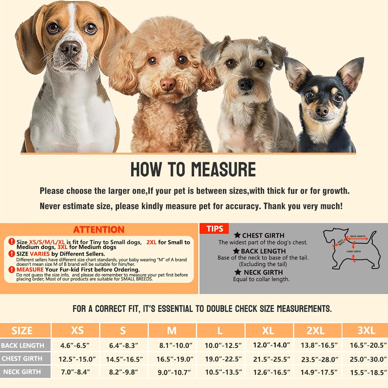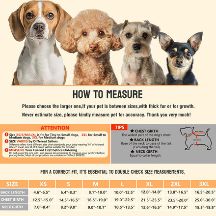 【Latest updated size information】Small medium dog raincoat has 3 colors and 7 sizes to choose.The rain coat for dogs covers 3-35 lbs pets.Designed for 17-43cm back lengths.Between sizes? Size up! (Pro Tip:Please kindly check size chart prior to purchase,and don't guess the size infor.Thank you!) Measure while pet standing.1: Neck/Chest/Back Length (see diagram);2: Add 1 finger space for mobility