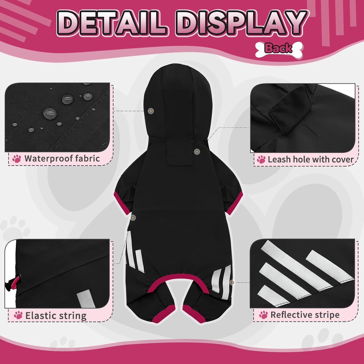 Fashion-design - Our dog rain coats adopt four-leg design, prevent water from all directions. Hidden traction mouth makes it convenient to connect the colla and leash. Legs tail adopt elastic wrap design, neck waist are designed with drawstring for adjustment.