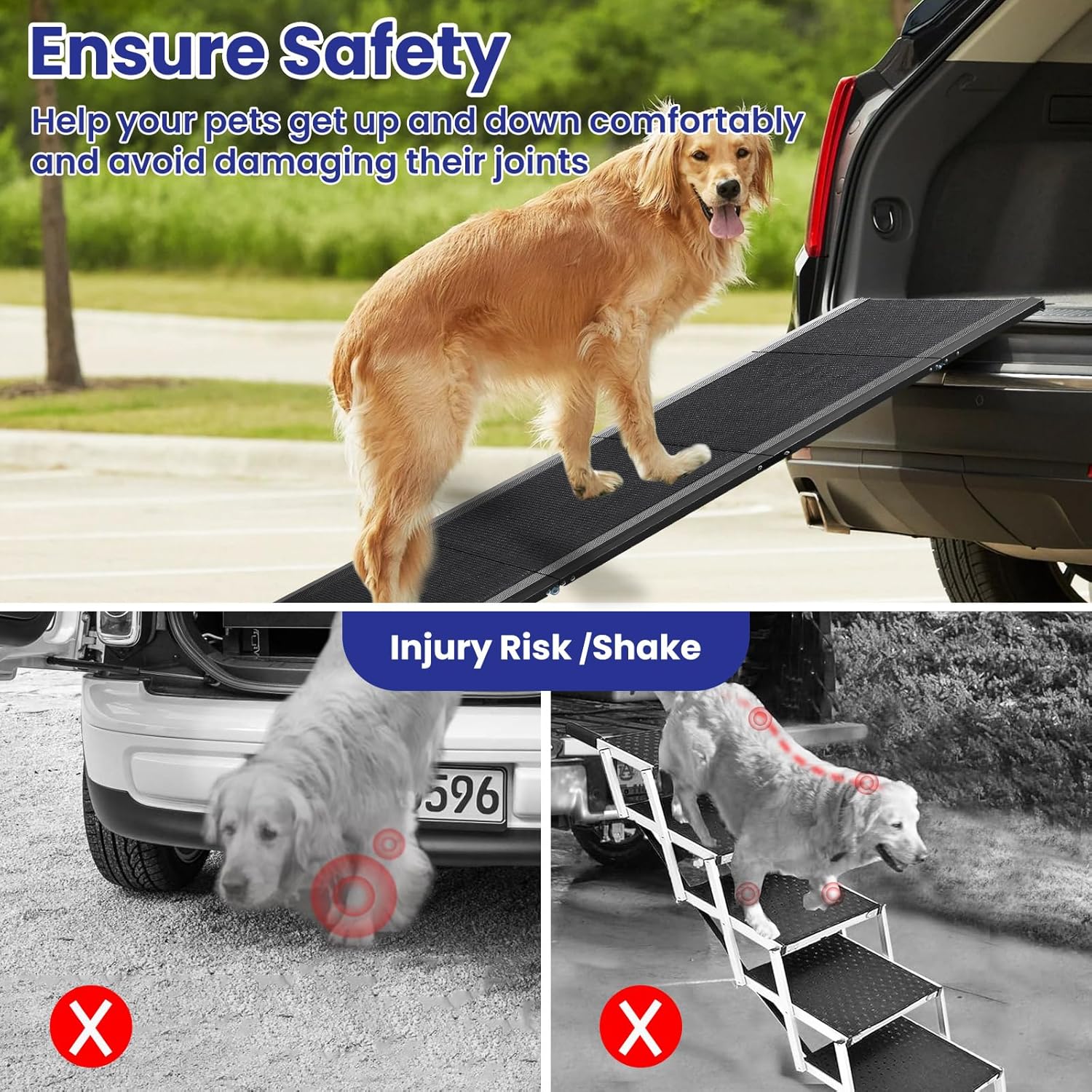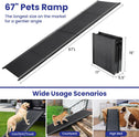 - Extended Design: The extra-long 67" dog ramp creates a gentler angle between the ramp and the vehicle, effectively reducing the risk of muscle strain and joint stress caused by jumping, protecting your pet's health. The top of the pet ramp has a safety strap buckle that can be securely fastened to the trunk latch, ensuring stability during use and allowing your dog to ascend and descend confidently.