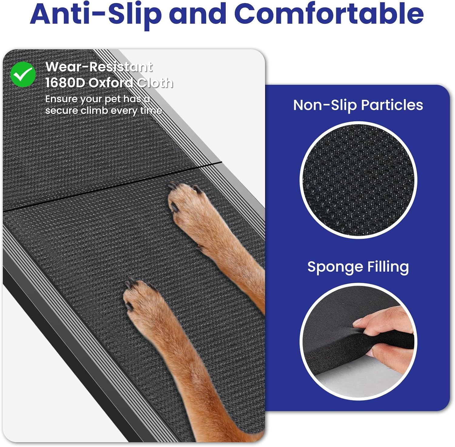 - Safety Design: The dog car ramp features high-density Oxford fabric with EPE pearl cotton padding, which provides a soft yet grippy texture and sufficient traction for your pet. The waterproof Oxford fabric wipes dirt away effortlessly, keeping the ramp hygienic. The dog steps is built with non-slip rubber pads, helping your furry friend climb stability onto cars, SUVs, trucks, or even high beds and sofas.