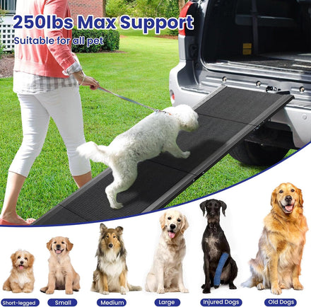 - Warm Note: We are pet-centric, and every detail of the dog ramp for truck is designed with their happiness in mind. Pets are highly intelligent animals, so for the first time, we should patiently guide and encourage them. When opening or folding the dog ramps, please keep your fingers away from the folding joints to prevent finger injuries.