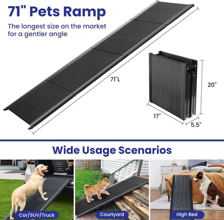 - Extended Design: The extra-long 71" dog ramp creates a gentler angle between the ramp and the vehicle, effectively reducing the risk of muscle strain and joint stress caused by jumping, protecting your pet's health. The top of the pet ramp has a safety strap buckle that can be securely fastened to the trunk latch, ensuring stability during use and allowing your dog to ascend and descend confidently.