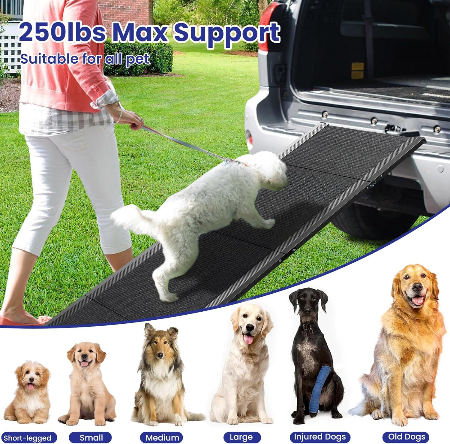 - Excellent Load Capacity: JTSIOV dog ramp for car is crafted from premium aluminum, offering exceptional strength and durability, supporting up to 250 lbs—perfect for large breeds, short-legged puppies, older pets, and dogs with mobility challenges. The outdoor dog ramp reinforced hinge system ensures superior stability across modules, supporting pets of all sizes for a secure, wobble-free climbing experience.