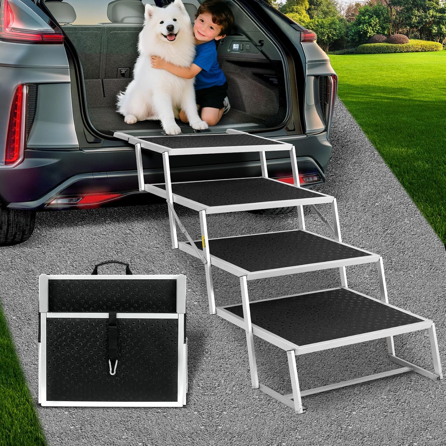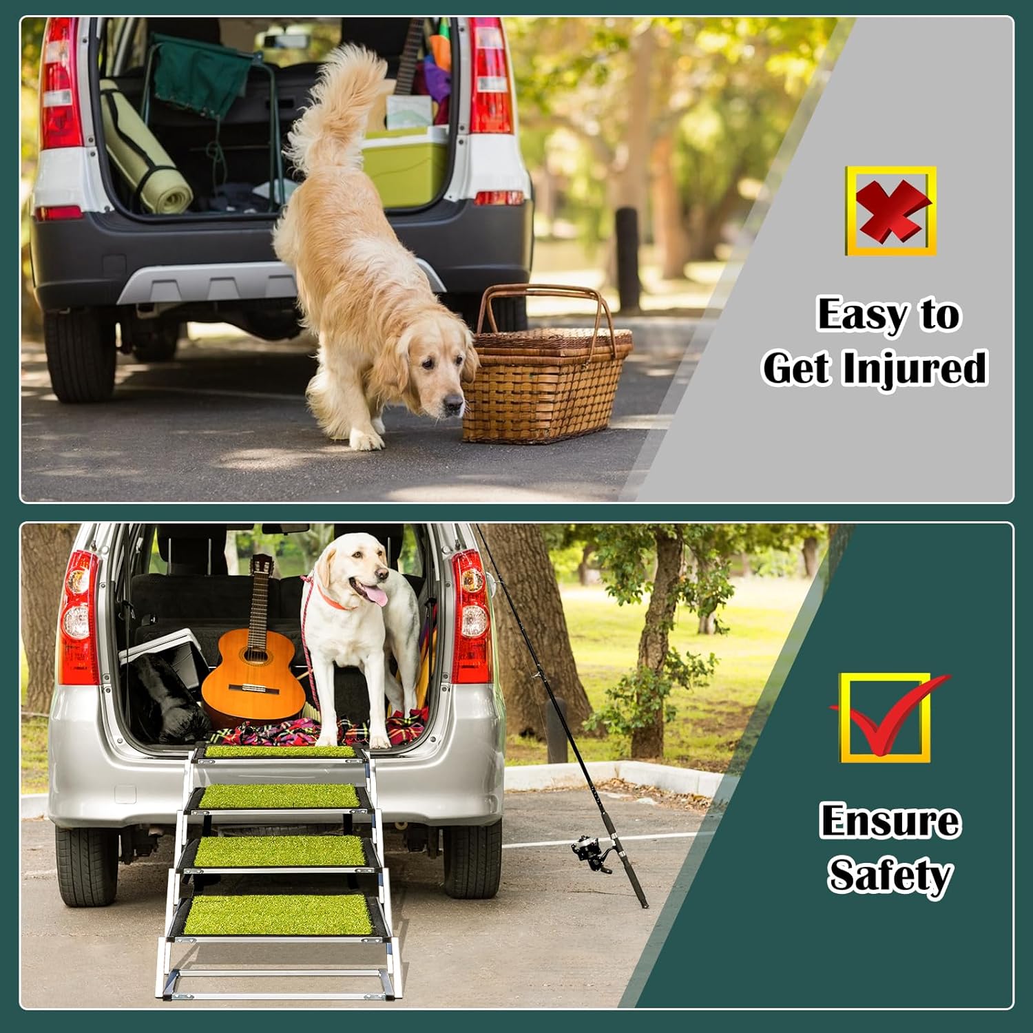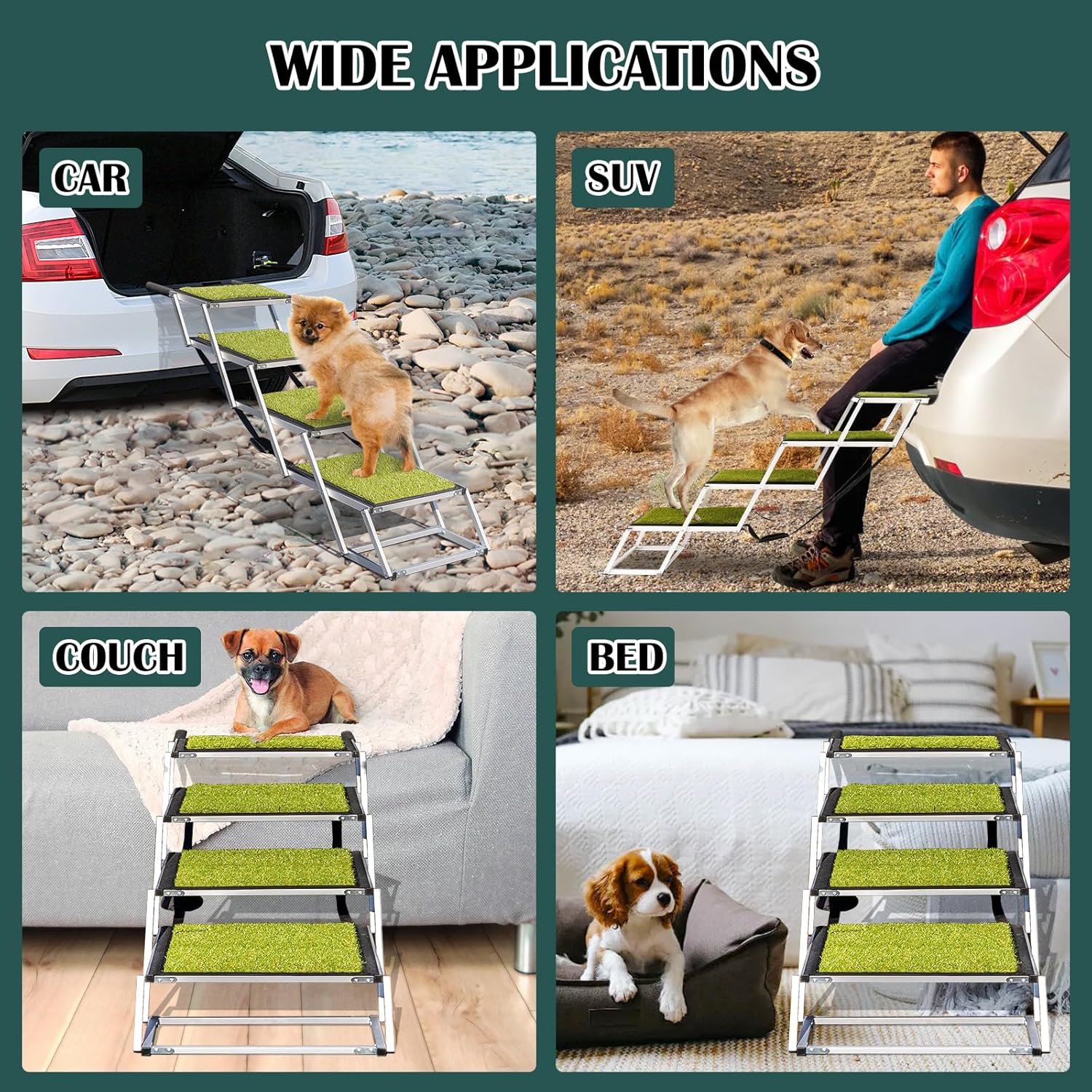 - MULTI-FUNCTIONAL DOGGIE STAIRS: This EXTRA WIDE 4 Dog steps has two angles to choose - Low Angle and normal stretch. The adjustable height means that is suitable for a variety of dogs to use in different scenes, it widely applys to outside house for getting into most of the vehicles, also indoors for puppies, short-legged dog to reach high beds, couches, windows, etc. If you have large dogs, arthritic dogs, puppies or cat that are not be able to climb on their own, this dog ladder is for you