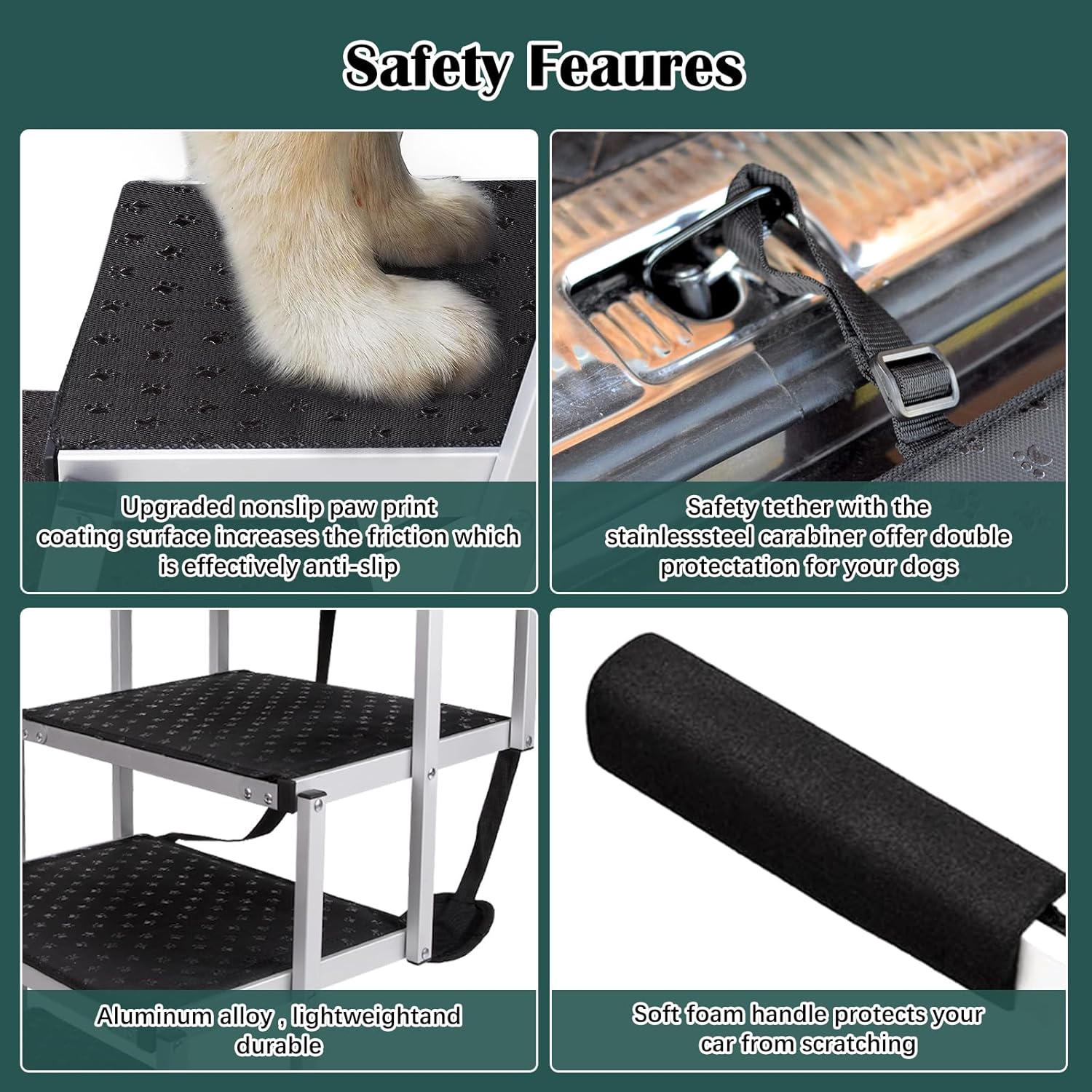 - THE WIDEST IN THE MARKET AND DESIGNED FOR DOG’S COMFORT: Our step is 20 " , the widest in the market! and It is more stable than a ramp, gentle incline put less pressure on a dog's front and back legs, give short legged, older, handicapped or injured dogs a secure platform to climb up and down safely or comfortably.With these features, this dog ramp cars suv trucks is easy to handle but super sturdy, no more back aches from lifting your fur babies from now on