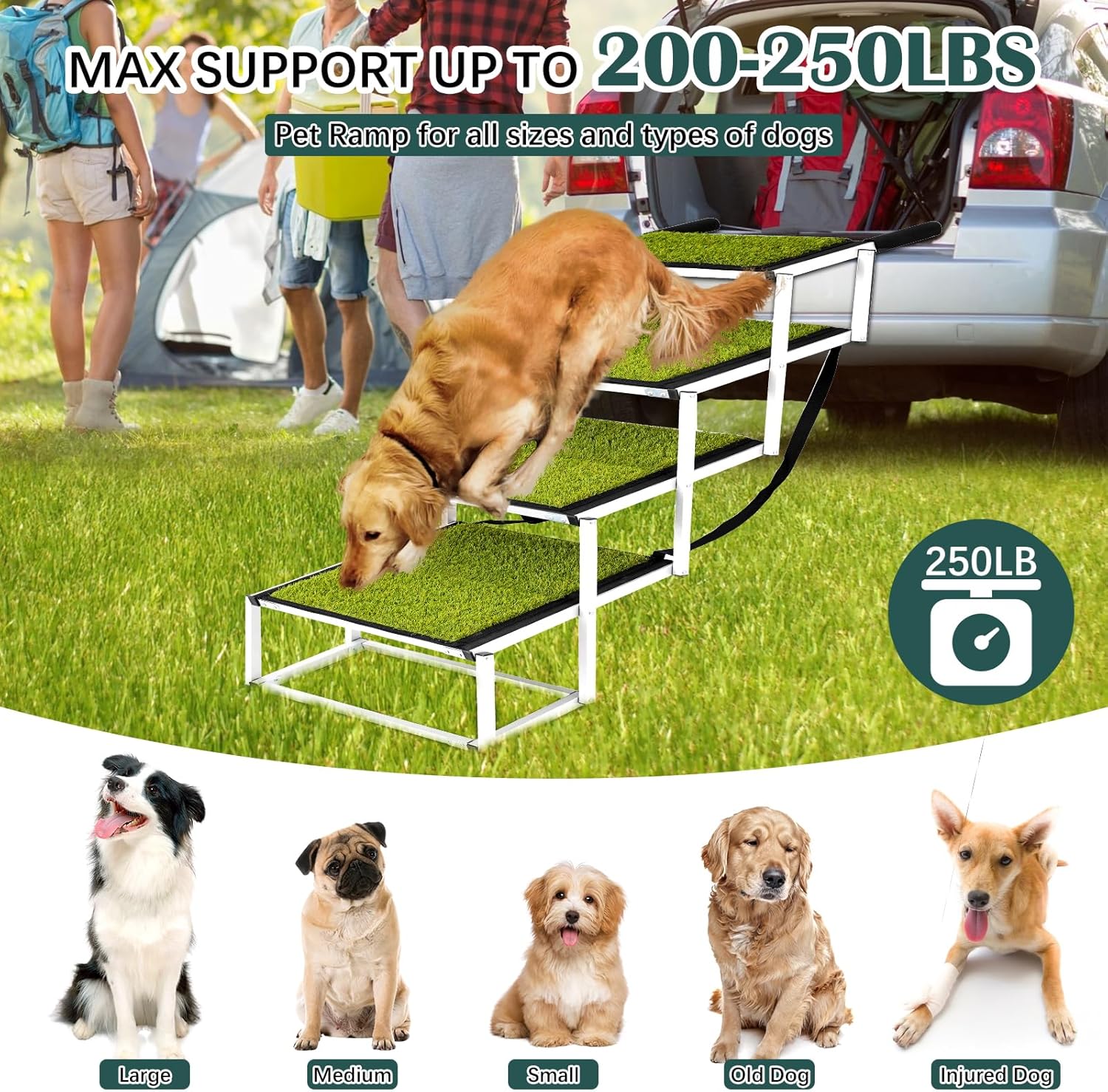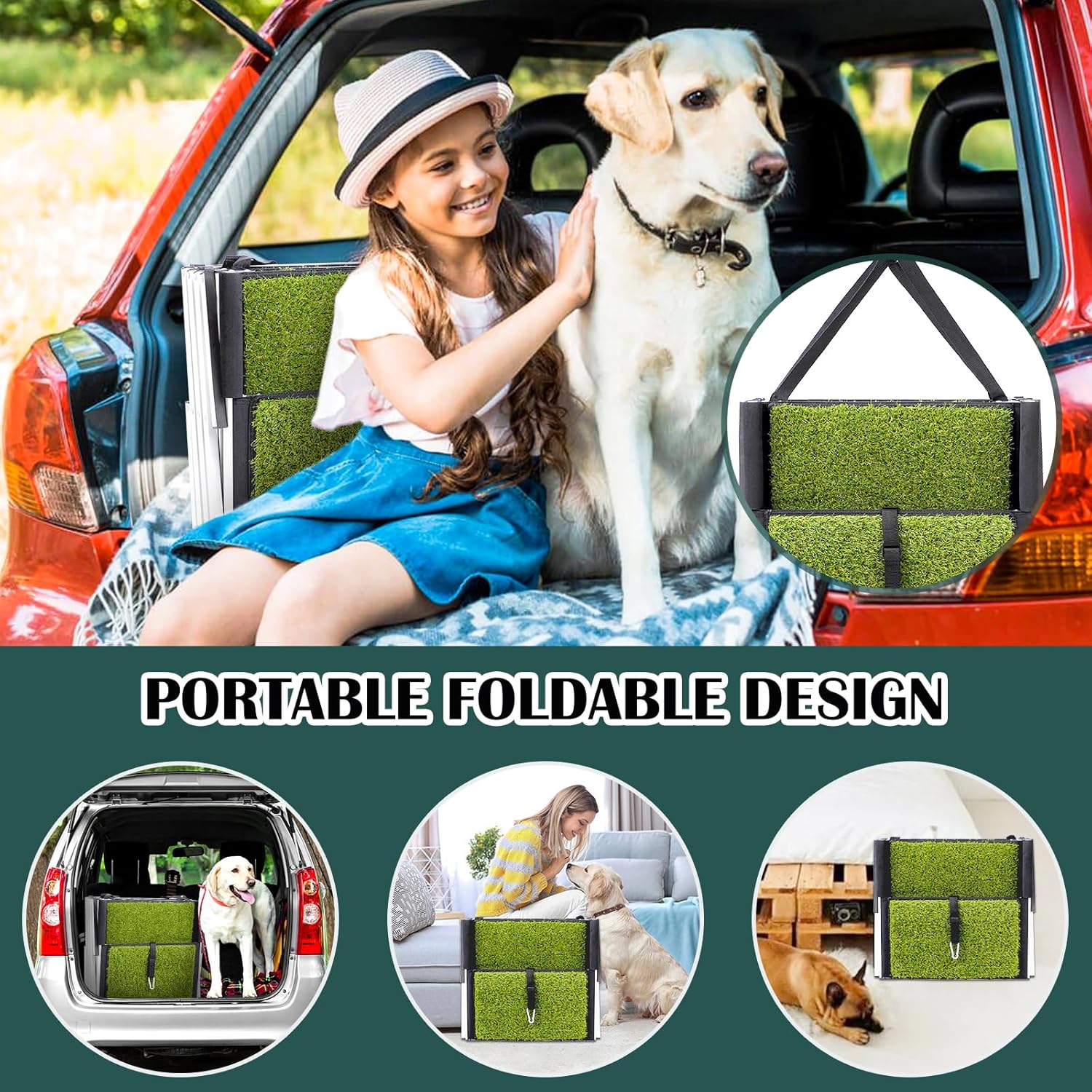 - ANTI-SLIP & COMFORTABLE: The walking surface of the dog ramp for car is covered with high traction grass surface, which provides your furry friends with optimal traction, prevent your pet from slipping while walking on the loading ramps