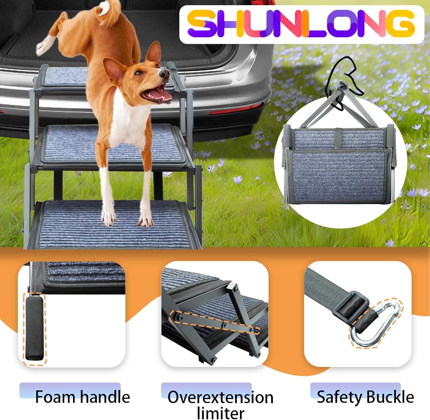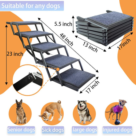 - Convenient Foldable Design:The dog stairs fold to 17" x 13" x 5.5" for easy storage, and a comfortable handle provides a secure grip for carrying. When extended, the ramp reaches 48" in length and 23" in height, offering an ideal slope for pets to access cars, trucks, and SUVs with ease.