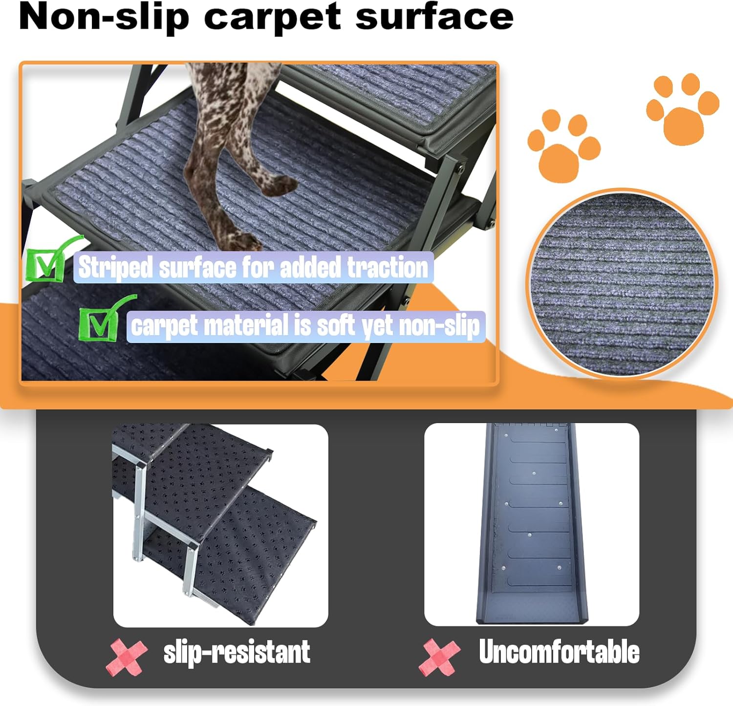 - Anti-Slip Carpet Surface:Our dog stairs features a durable anti-slip rug surface that provides superior traction, even in wet conditions. The soft felt material offers comfort while reducing slipping risks, easing joint pressure, and ensuring stability for your pet as they climb or descend.