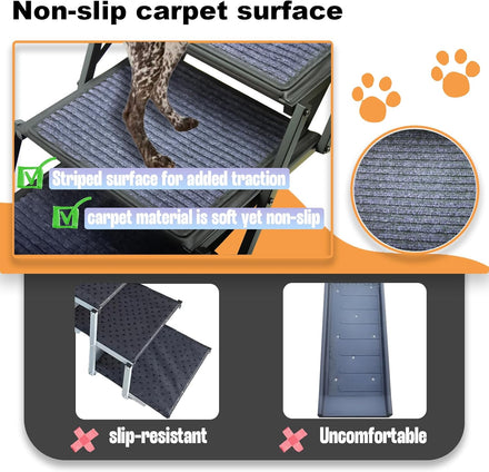 The stairs feature an adjustable safety lock to secure them in place and prevent sliding. The carpeted surface adds grip and comfort, ensuring your dog can safely and steadily get in and out of the car.